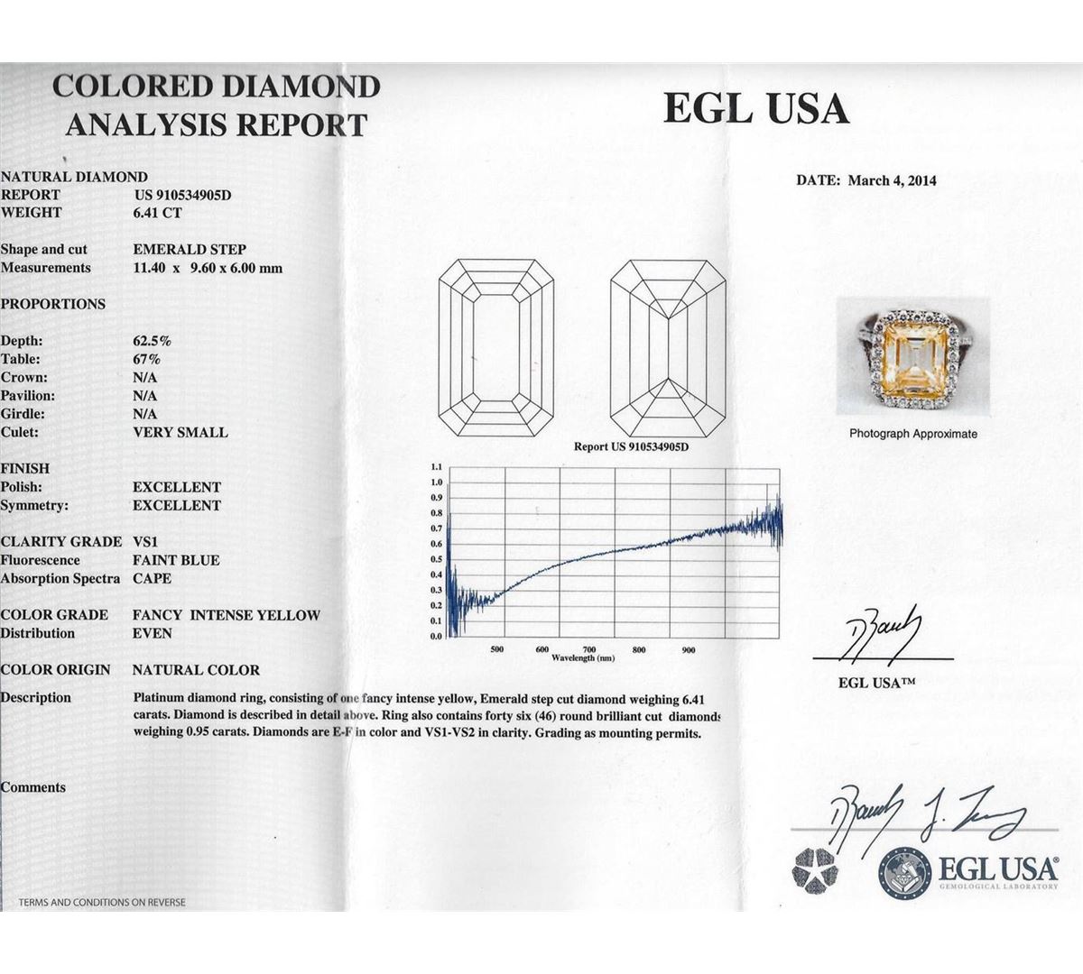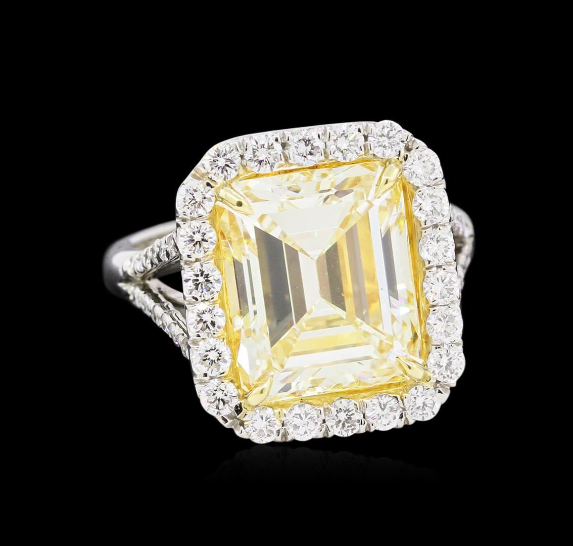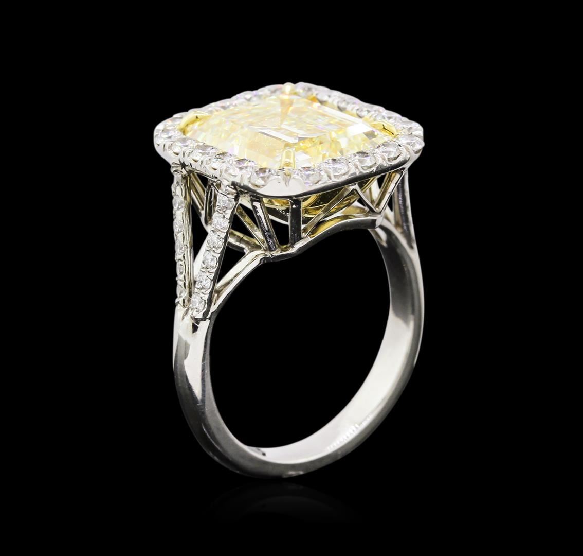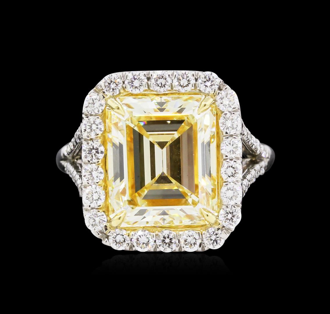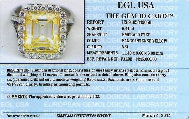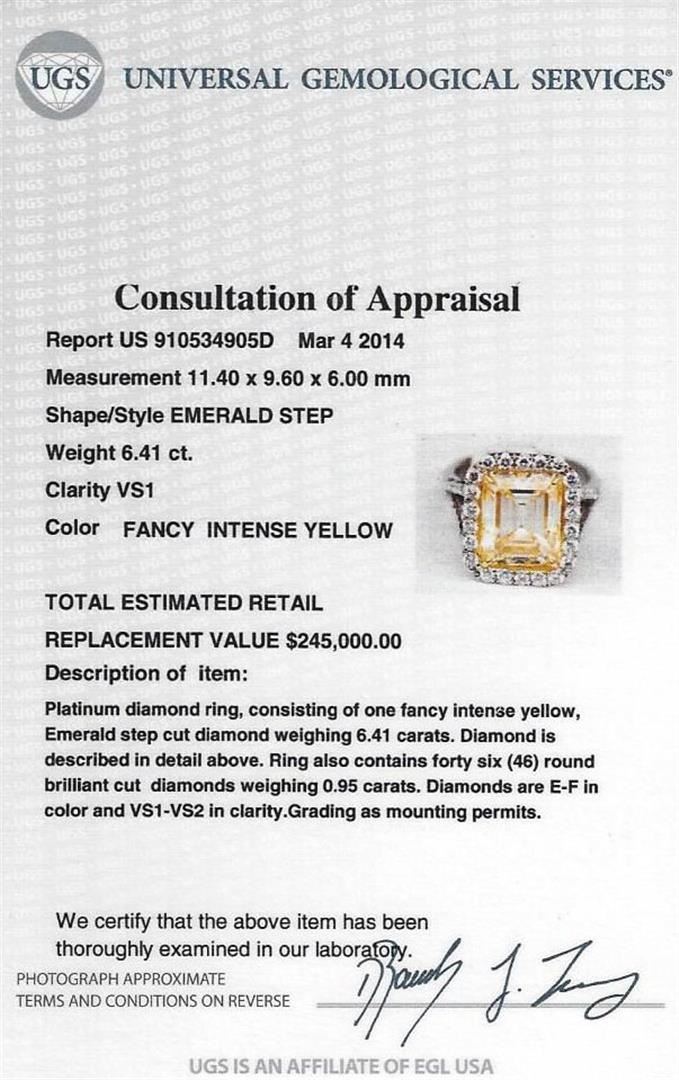 One EGL USA Certified platinum diamond ring, consisting of one (1) fancy intense yellow, emerald step cut diamond weighing 6.41 carats. Clarity: VS1. Measurements: 11.40 x 9.60 x 6.00mm. Ring also contains forty six (46) round brilliant cut diamonds weighing 0.95 carats. Diamonds are E-F in color and VS1-VS2 in clarity. Total Weight of Ring: 10.20 grams. UGS Appraised at $245,000.00.