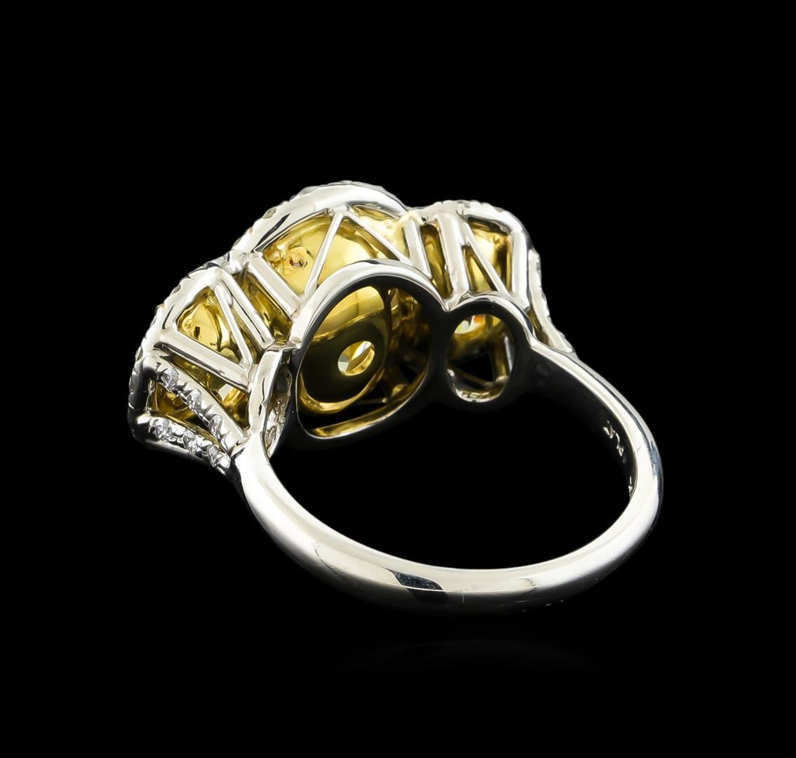 One three stone ring featuring: platinum consisting of one center oval brilliant diamond measuring 10.90 x 8.50 x 6.28mm weighing 5.01ct. Diamond is fancy yellow to fancy intense yellow in color and VS2 in clarity. Ring also contains two (2) side oval brilliant cut fancy yellow to fancy intense yellow diamonds weighing 3.04ct and VS1-VS2 in clarity, as well as forty six (46) round brilliant cut diamonds weighing 0.61ct. Diamonds are F-G in color and VS2-SI3 in clarity. EGL USA Appraised.