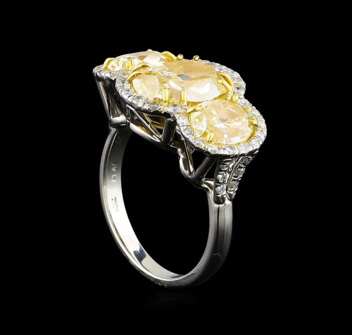 One three stone ring featuring: platinum consisting of one center oval brilliant diamond measuring 10.90 x 8.50 x 6.28mm weighing 5.01ct. Diamond is fancy yellow to fancy intense yellow in color and VS2 in clarity. Ring also contains two (2) side oval brilliant cut fancy yellow to fancy intense yellow diamonds weighing 3.04ct and VS1-VS2 in clarity, as well as forty six (46) round brilliant cut diamonds weighing 0.61ct. Diamonds are F-G in color and VS2-SI3 in clarity. EGL USA Appraised.