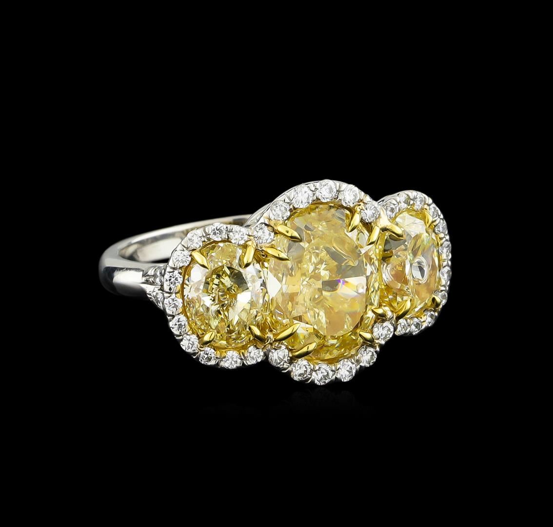 One three stone ring featuring: platinum consisting of one center oval brilliant diamond measuring 10.90 x 8.50 x 6.28mm weighing 5.01ct. Diamond is fancy yellow to fancy intense yellow in color and VS2 in clarity. Ring also contains two (2) side oval brilliant cut fancy yellow to fancy intense yellow diamonds weighing 3.04ct and VS1-VS2 in clarity, as well as forty six (46) round brilliant cut diamonds weighing 0.61ct. Diamonds are F-G in color and VS2-SI3 in clarity. EGL USA Appraised.