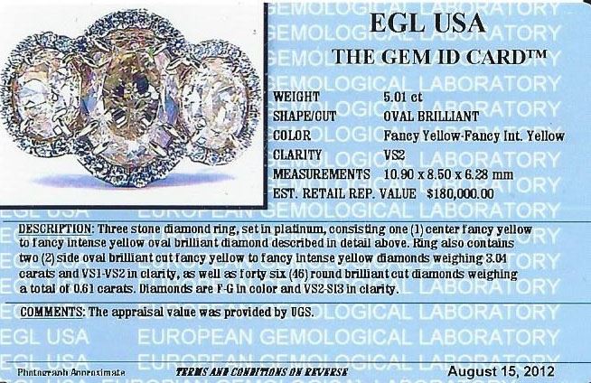 One three stone ring featuring: platinum consisting of one center oval brilliant diamond measuring 10.90 x 8.50 x 6.28mm weighing 5.01ct. Diamond is fancy yellow to fancy intense yellow in color and VS2 in clarity. Ring also contains two (2) side oval brilliant cut fancy yellow to fancy intense yellow diamonds weighing 3.04ct and VS1-VS2 in clarity, as well as forty six (46) round brilliant cut diamonds weighing 0.61ct. Diamonds are F-G in color and VS2-SI3 in clarity. EGL USA Appraised.
