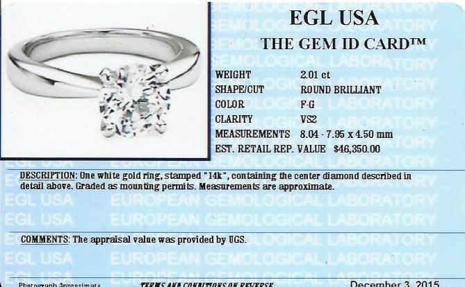 Up for auction is a beautiful EGL USA Certified 14KT white gold diamond solitaire ring! Stamped "14k", the ring contains a 2.01ct center diamond. Graded as mounting permits. Shape and Cut: Round brilliant. Measurements: 8.04 - 7.95 x 4.50mm. Culet: None. Clarity Grade: VS2. Color Grade: F-G. Fluorescence: None. Measurements are approximate. The ring weighs a total of 2.40 grams. UGS Appraised at $46,350.00.