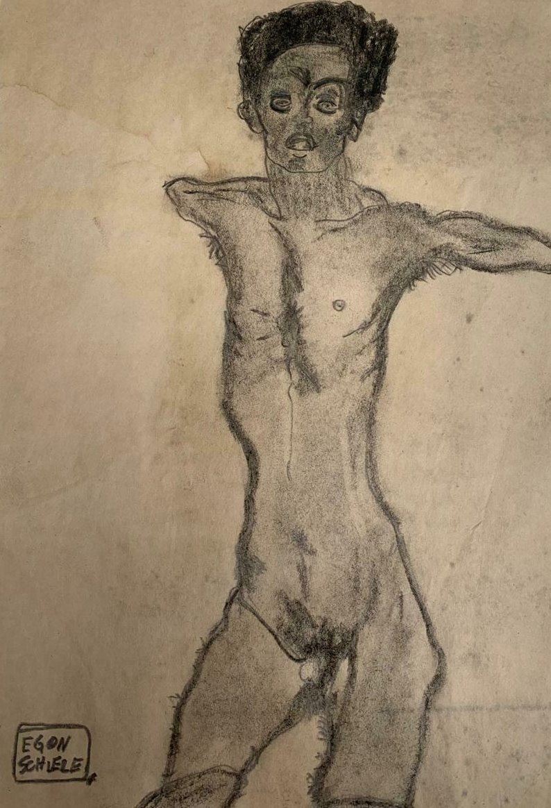 At the age of just 16, Egon Schiele moved to Vienna to study at the Academy of Fine Arts. Vienna in the early 1900s was in the grip of an artistic revolution — in 1897 Gustav Klimt had formed the Vienna Secession, a movement that believed an artist’s duty was to free culture from the grips of the establishment. Klimt, whom Schiele greatly admired, became the young artist’s mentor. It was Klimt who introduced the young Schiele to the arts and crafts of the Wiener Werkstätte. Much of Schiele’s art focused on the eroticised, human form. The Expressionist style Schiele developed was stark, raw and deeply emotional, and executed in a sombre palette. This drawing by Egon Schiele is a self portrait in pencil, signed and also stamped by the Leopold museum in Vienna on the back. Mounted and framed and supplied with coa.