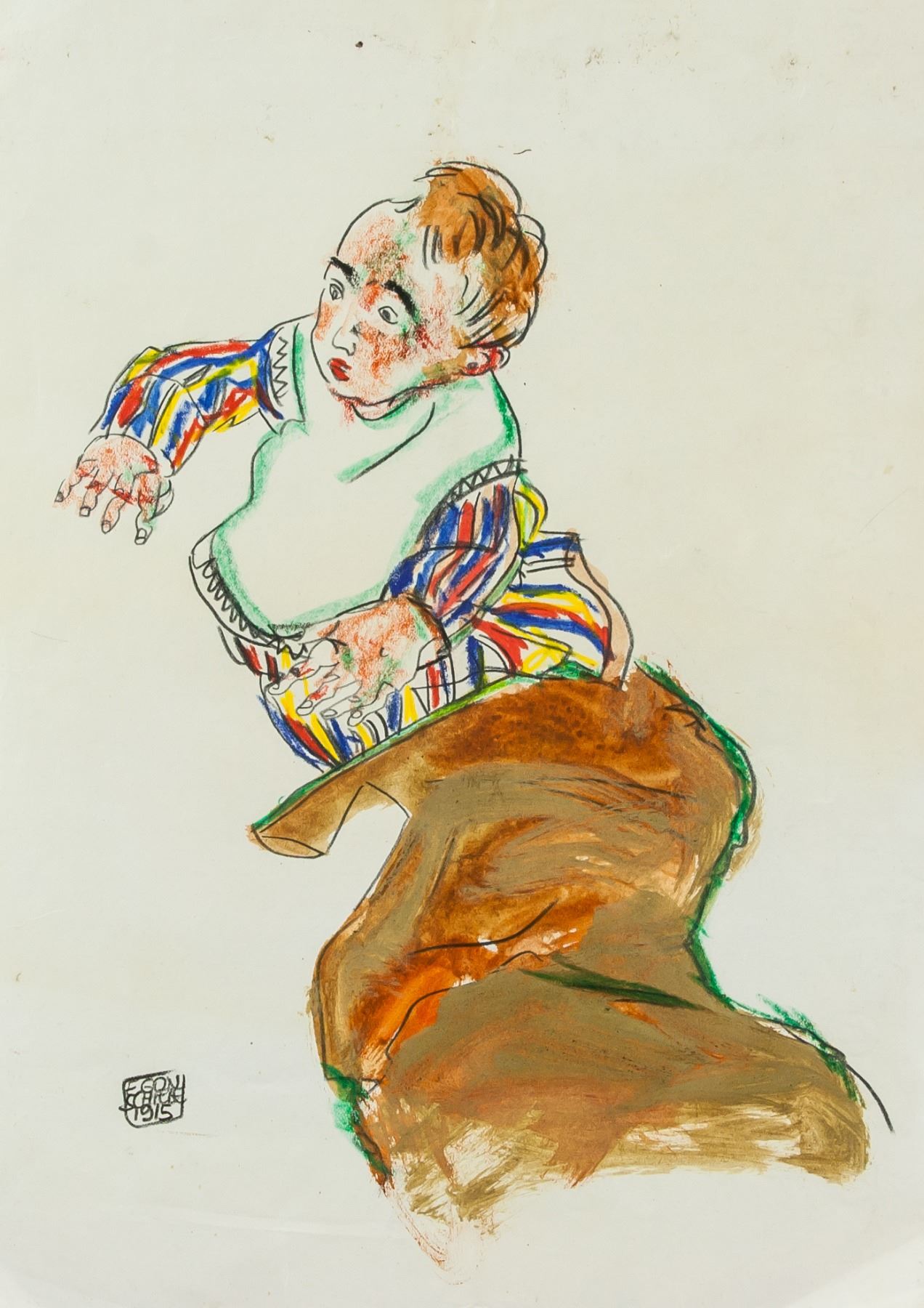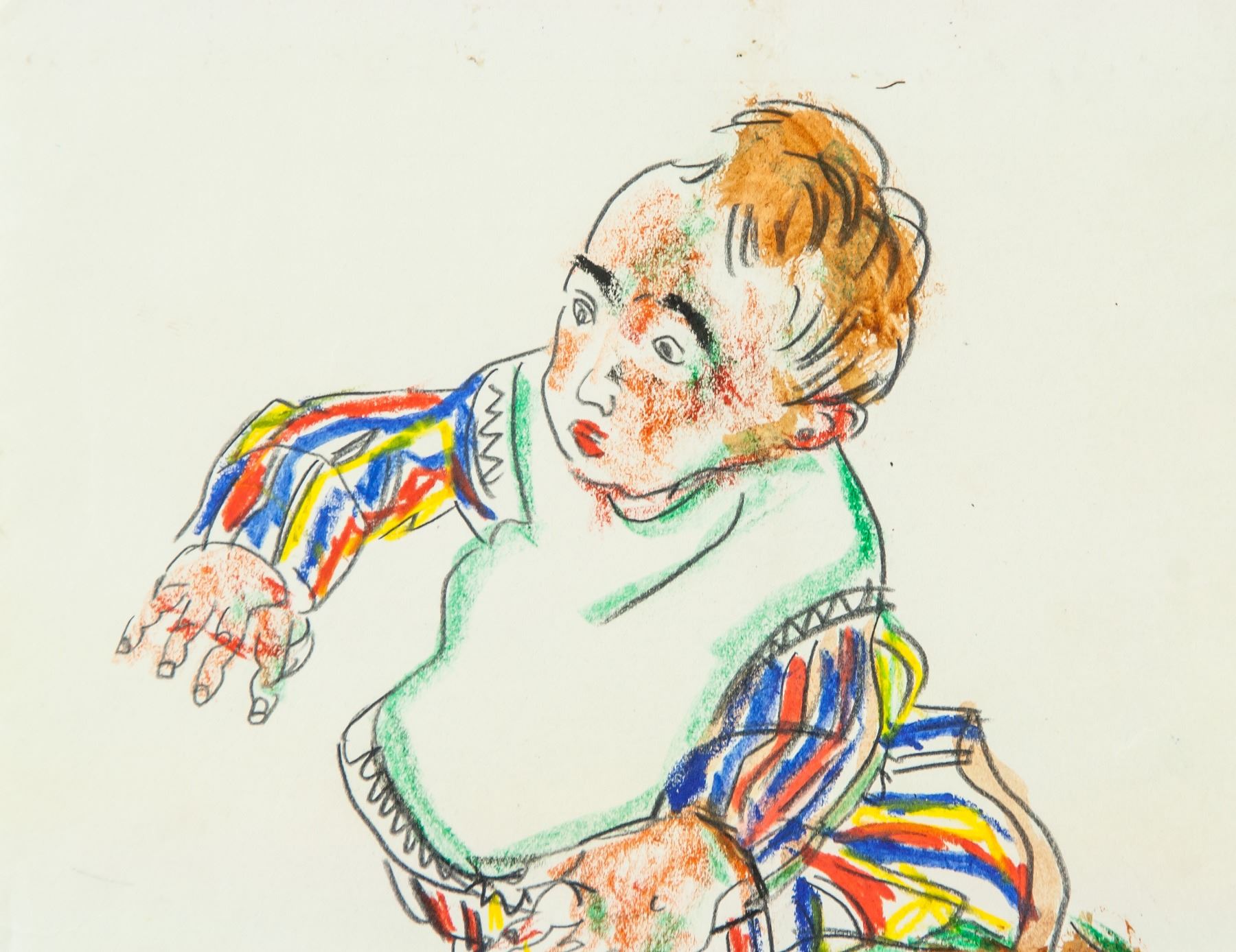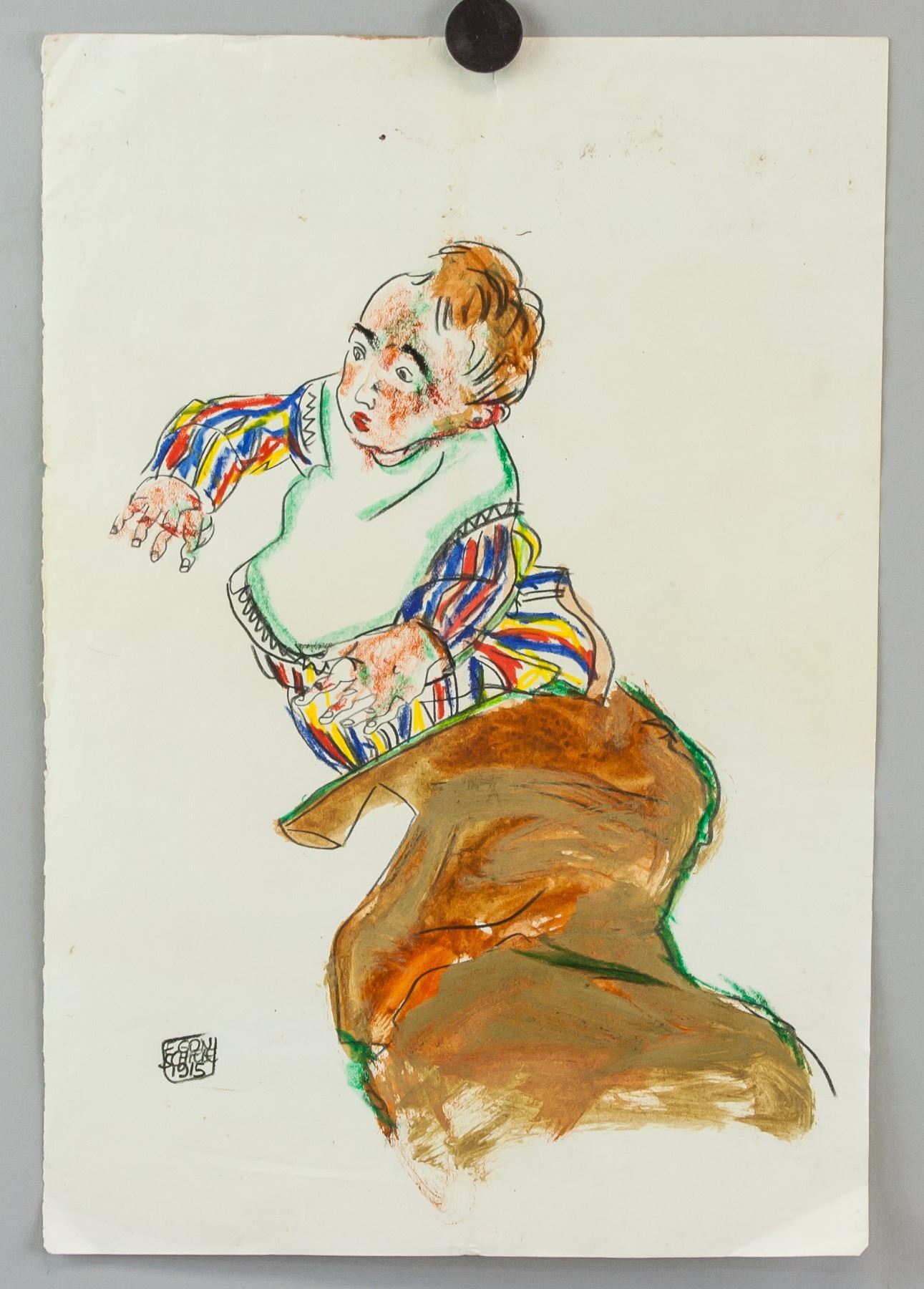 Watercolor, tempera and pastel on paper. Featuring a child. Signed and attr. Egon Schiele (Austrian, 1890-1918) and dated 1915 on lower left corner. 12 x 8.3 in. (30.5 x 21 cm). A great innovator of modern figure painting, Egon Schiele is known for creating erotic and deeply psychological portraits, on many occasions using himself as the subject. Schiele often used color sparingly, his work identifiable instead by his characteristic sinuous black line. In his many self-portraits, Schiele is typically nude and staring directly towards the viewer, making the works both revealing and confrontational. Schiele’s female subjects are often nude as well, their bodies portrayed in various contorted positions. Whether representing himself or others, Schiele’s pictures are strikingly raw and direct. A student of the famous Symbolist artist Gustav Klimt, Schiele’s body of landscapes (though only a small collection) evoked Klimt’s folkloric tone and flattened compositional space. Schiele was prolific, but his artistic career ended tragically when he fell victim to the Spanish flu in 1918 at only 28 years of age. PROVENANCE: Private estate (Italy)