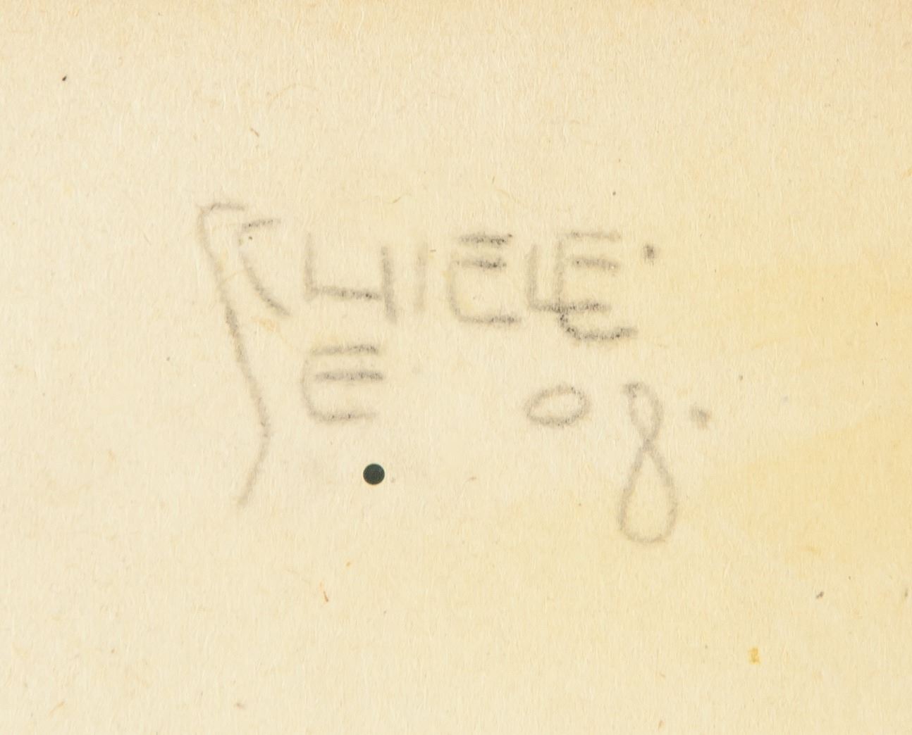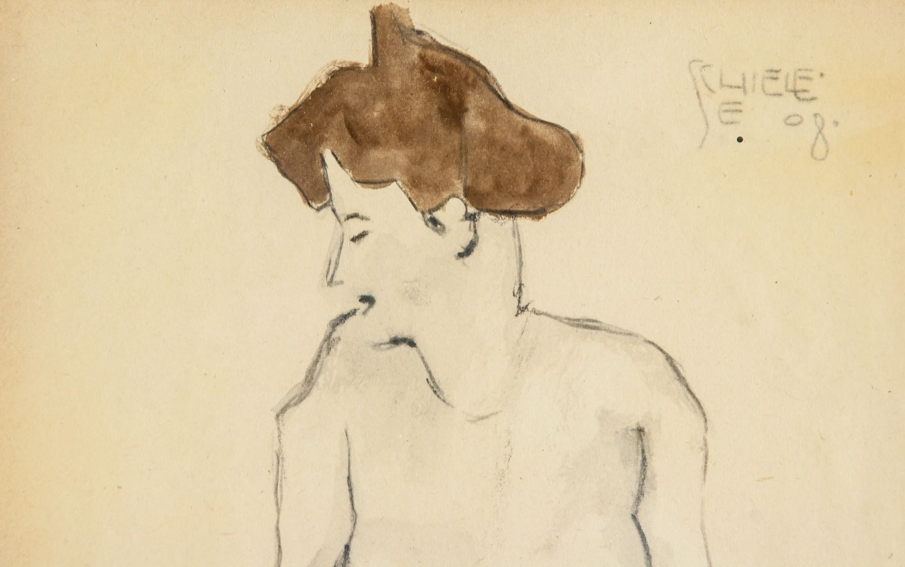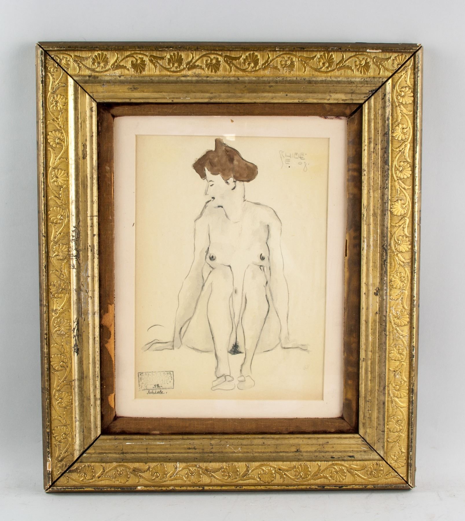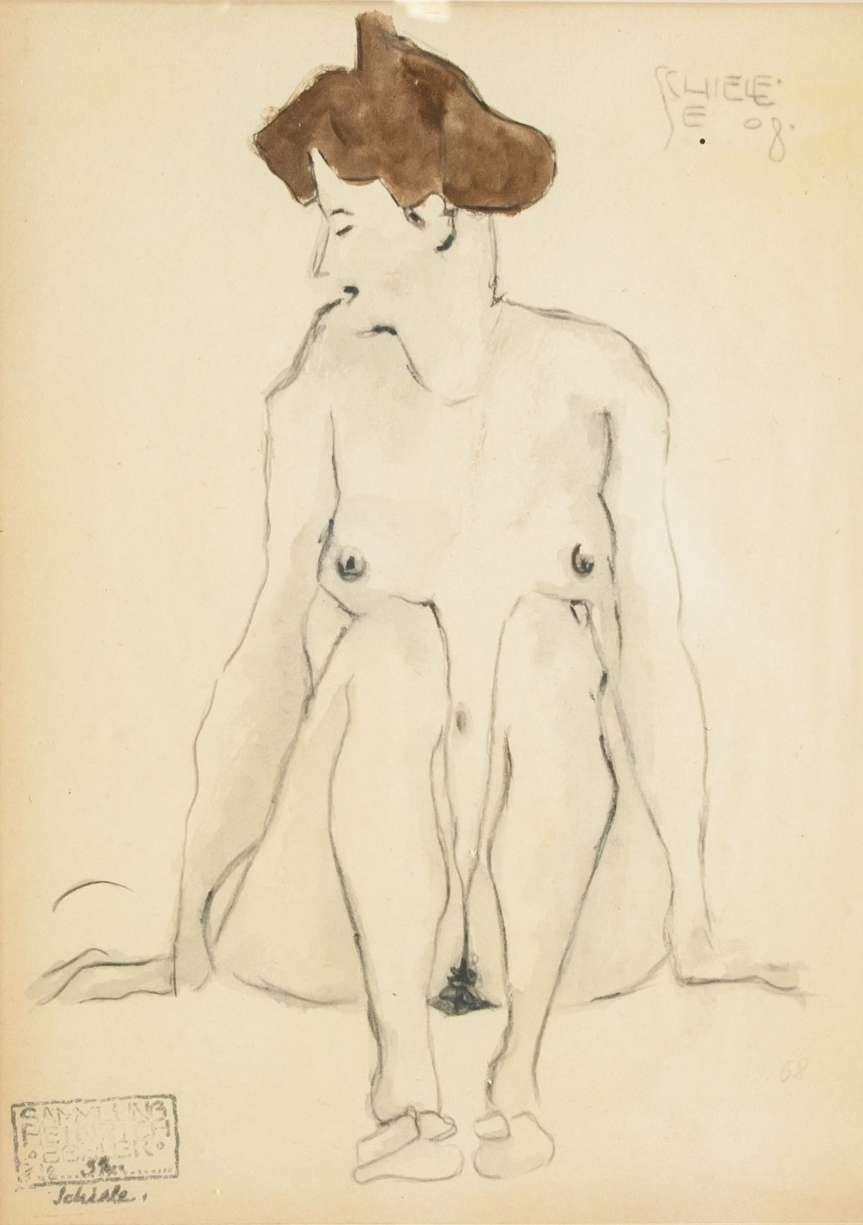 Watercolor and graphite on paper. Featuring a female nude. Signed and attr. Egon Schiele (Austrian, 1890-1918) on the upper right corner, gallery stamp on the lower left corner. 27.5 x 20 cm (10.8 x 7.9 in.) A great innovator of modern figure painting, Egon Schiele is known for creating erotic and deeply psychological portraits, on many occasions using himself as the subject. Schiele often used color sparingly, his work identifiable instead by his characteristic sinuous black line. In his many self-portraits, Schiele is typically nude and staring directly towards the viewer, making the works both revealing and confrontational. Schiele’s female subjects are often nude as well, their bodies portrayed in various contorted positions.