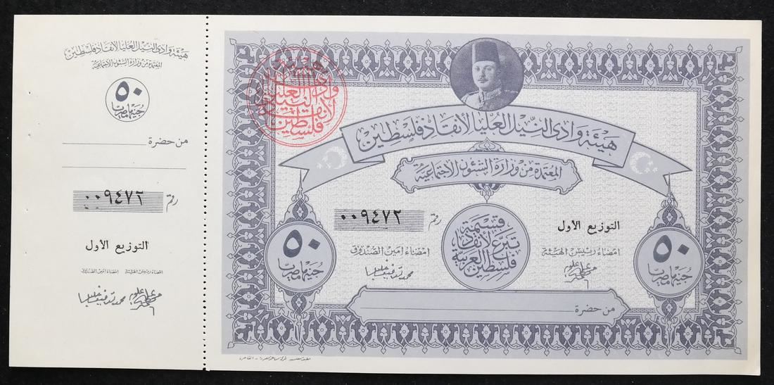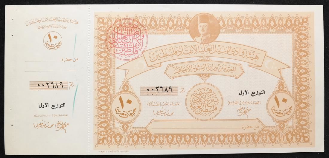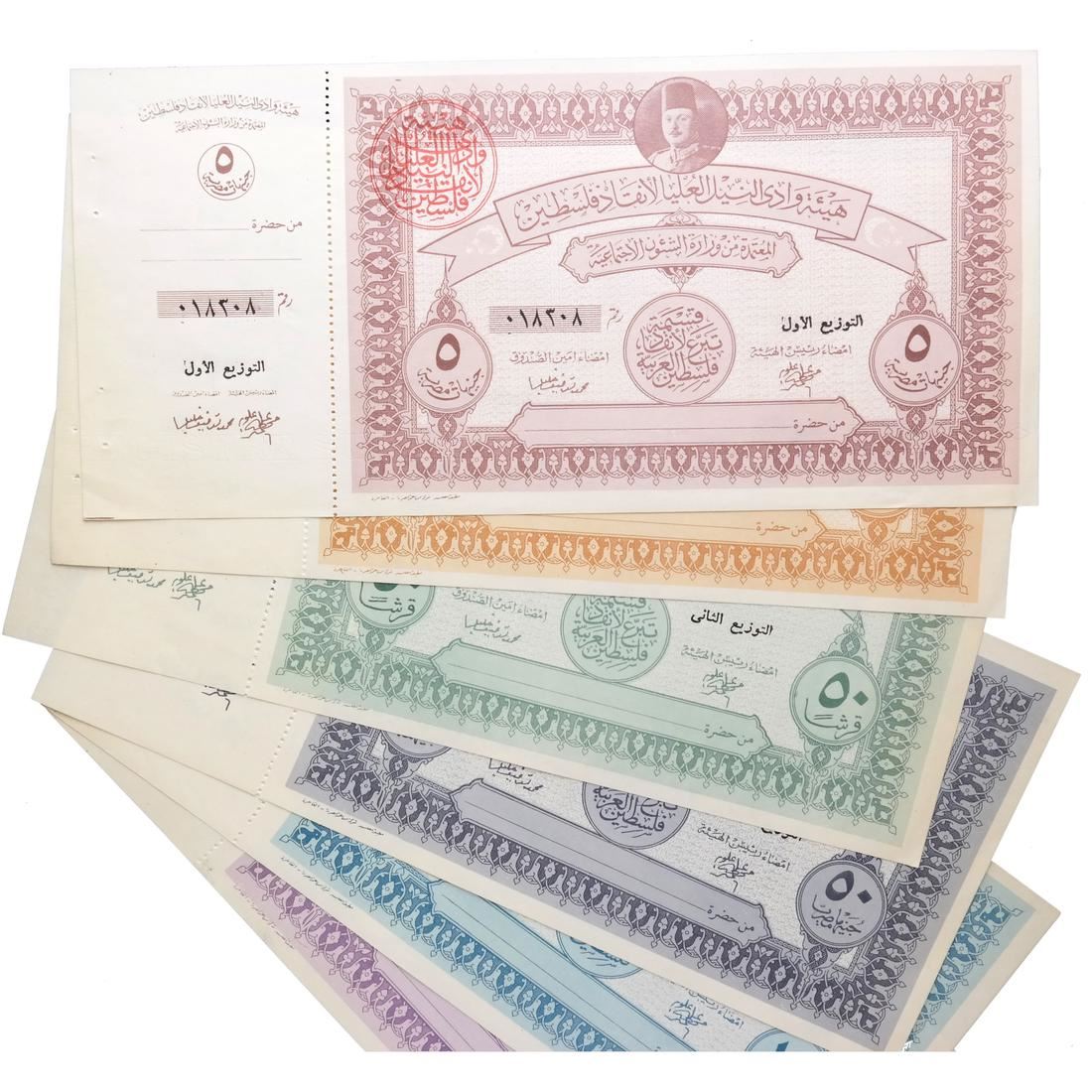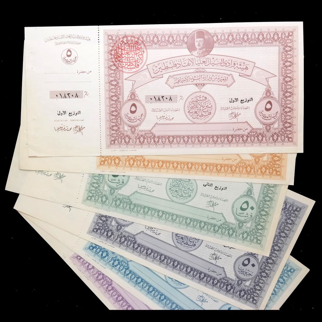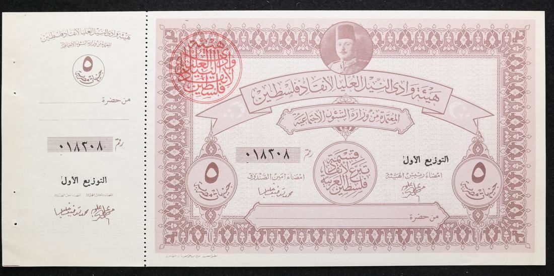 Includes 5, 10, two 50 and two 100 war fund savings notes with original attached counterfoils and red control handstamps, issued to raise funds for the war with Israel, also includes booklet panes of four of 2pi and 5pi values, some have control handstamps on back, sound and Uncirculated.