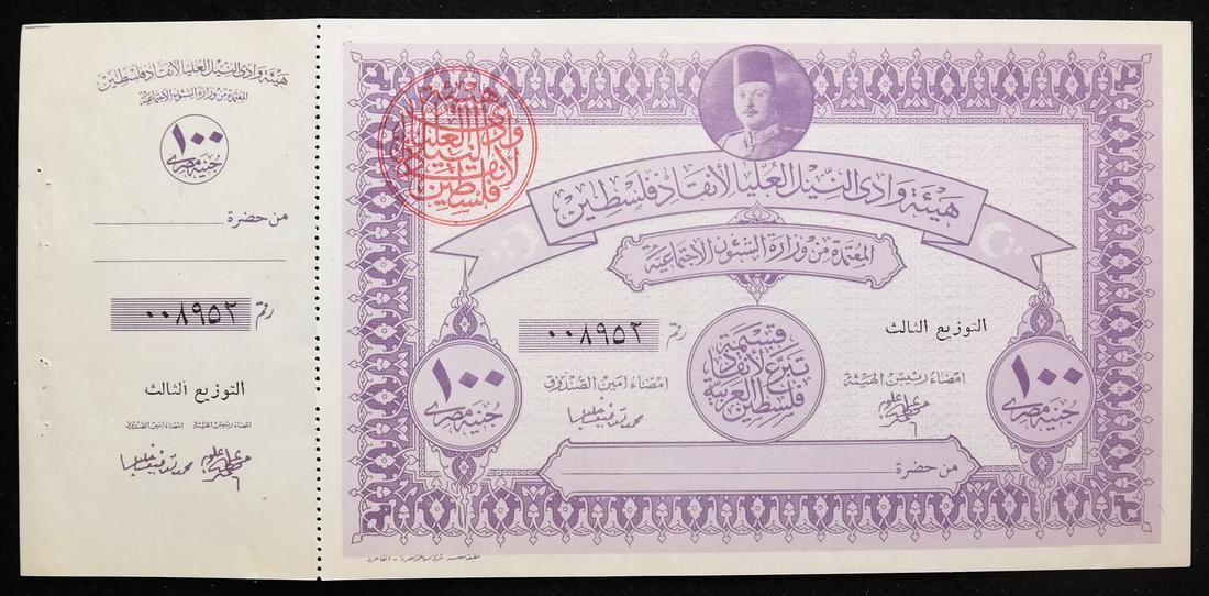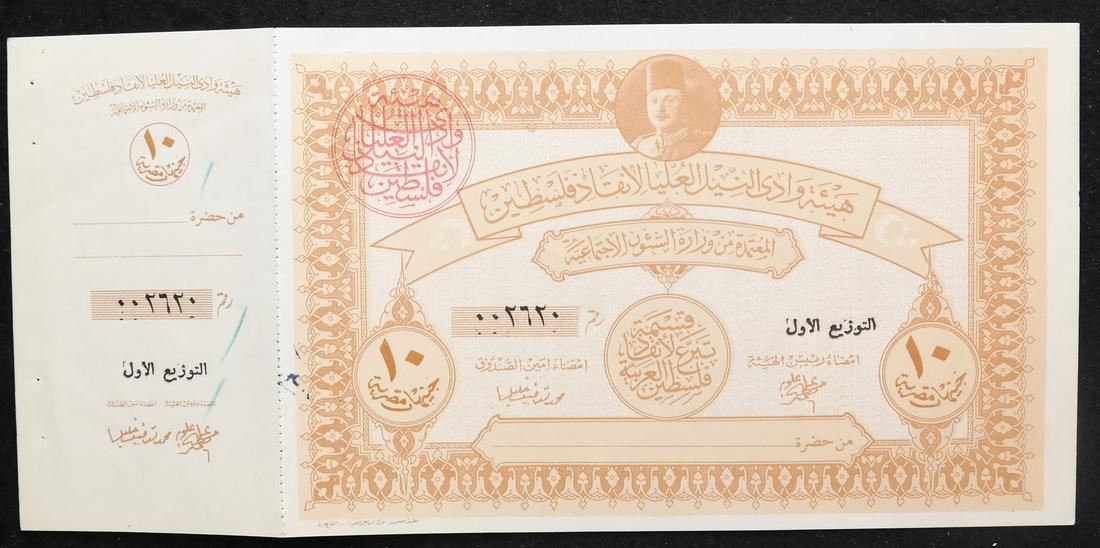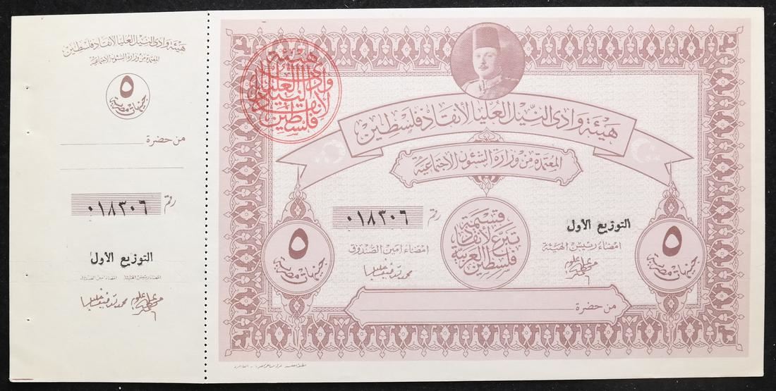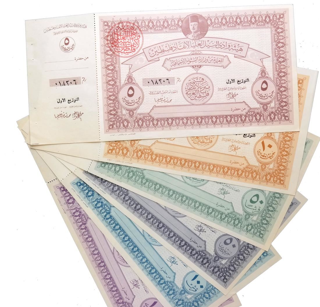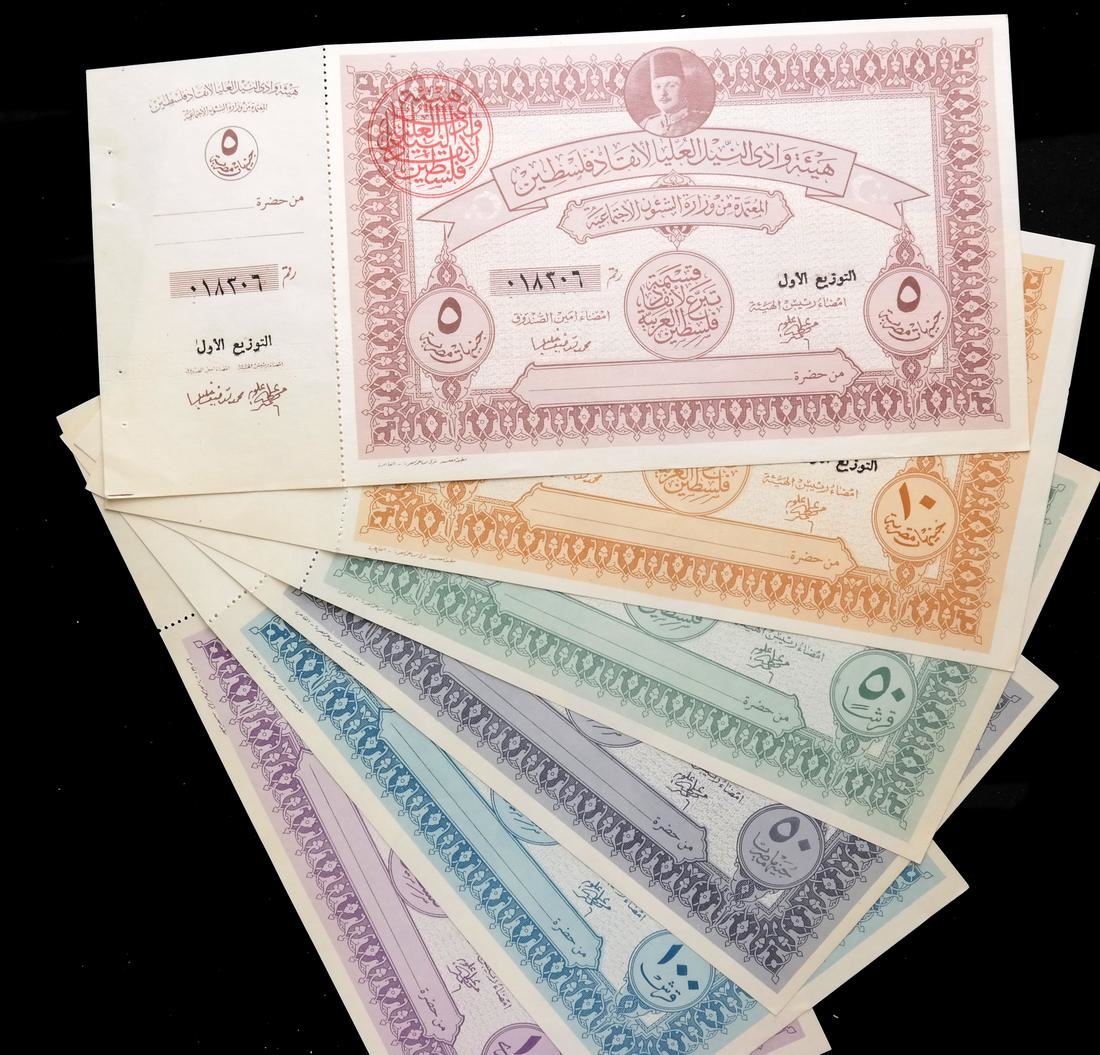 Includes 5, 10, two 50 and two 100 war fund savings notes with original attached counterfoils and red control handstamps, issued to raise funds for the war with Israel, some have control handstamps on back, sound and Uncirculated.