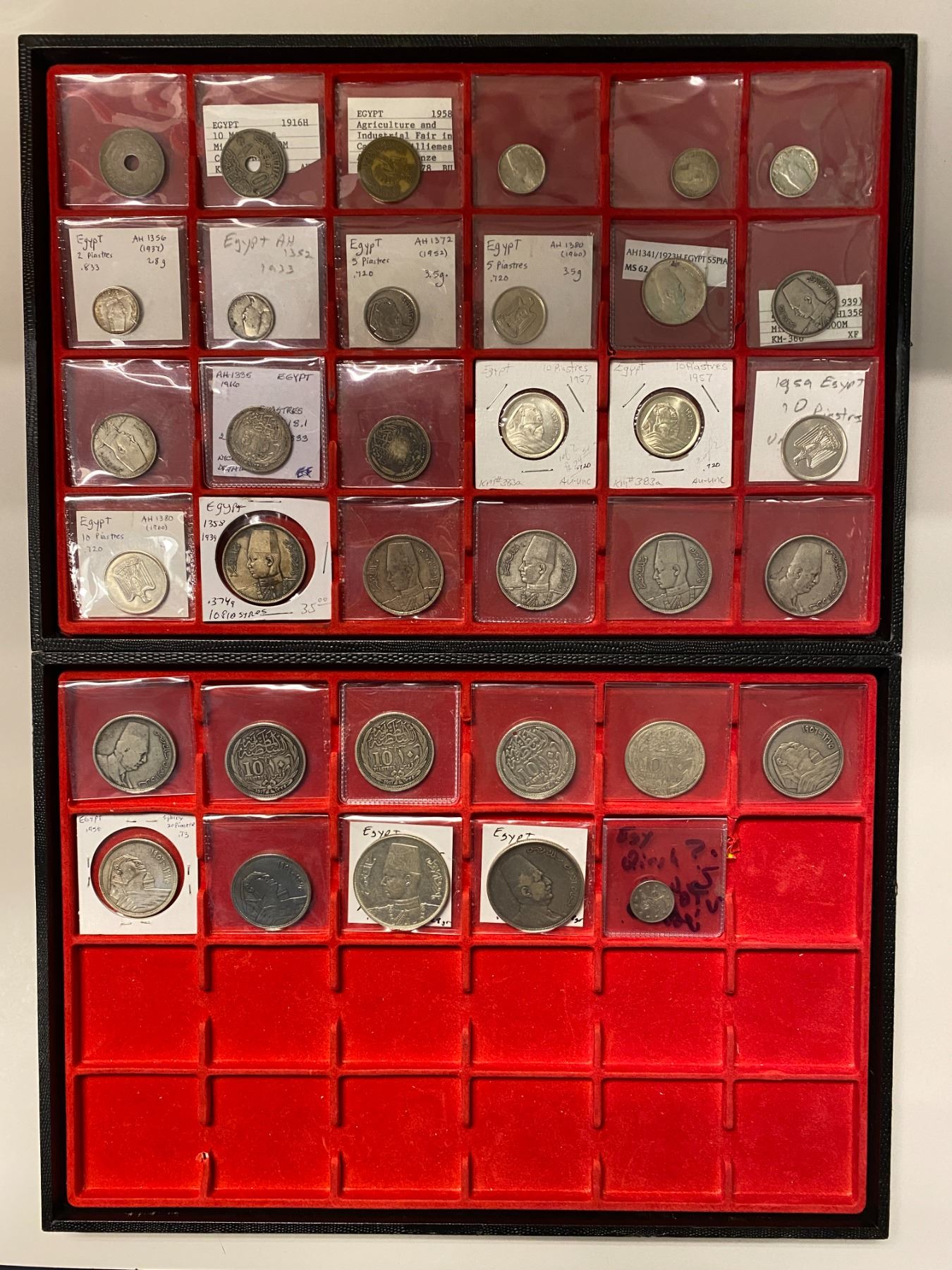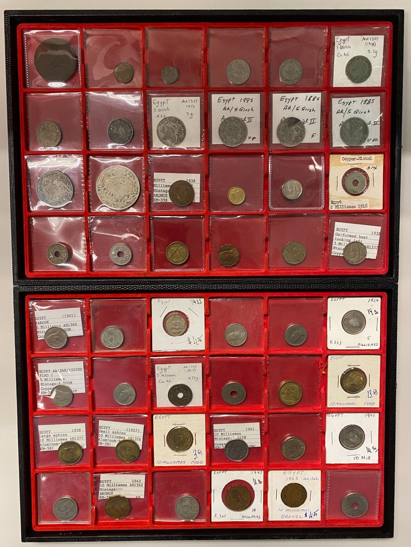 EGYPT AND TURKEY: LOT of 83 coins, including Egypt: 40 para (1 pc), 1/40 qirsh (1), 1/10 qirsh (1), 5/10 qirsh (2), qirsh (3), 5 qirsh (4), 10 qirsh (1), 20 qirsh (1), millieme (1), 2 milliemes (5), 5 milliemes (14), 10 milliemes (16), 20 milliemes (1), 2 piastres (5), 5 piastres (7), 10 piastres (14), and 20 piastres (5); and Turkey (1, 2 piastres); average circulated grades, as well as a few uncs, many are silver, in consignor's 2x2 holders, viewing recommended; retail value $525, lot of 83 coins.