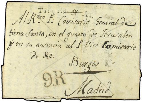 1825 (July 31) Entire letter from Spanish Missionary at Rosetta to Burgos. Mailed from Alexandria probably via Constantinople and struck with ´Turquie´ and ´AT´ in black, reverse with circular Disinfection cachet of Semlin alongside Madrid datestamp, charged with ´9R´ in black. An extraordinary and rare cover to a most unusual destination for Egyptian mail of this period.