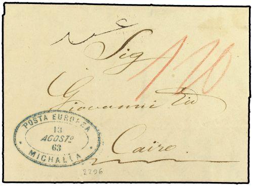 1863 Pre-stamp envelope to Cairo cancelled by oval POSTA EUROPEA MICHALIA datestamp in blue, charged "120" in manuscript with arrival in CAIRO on reverse. Very fine quality.