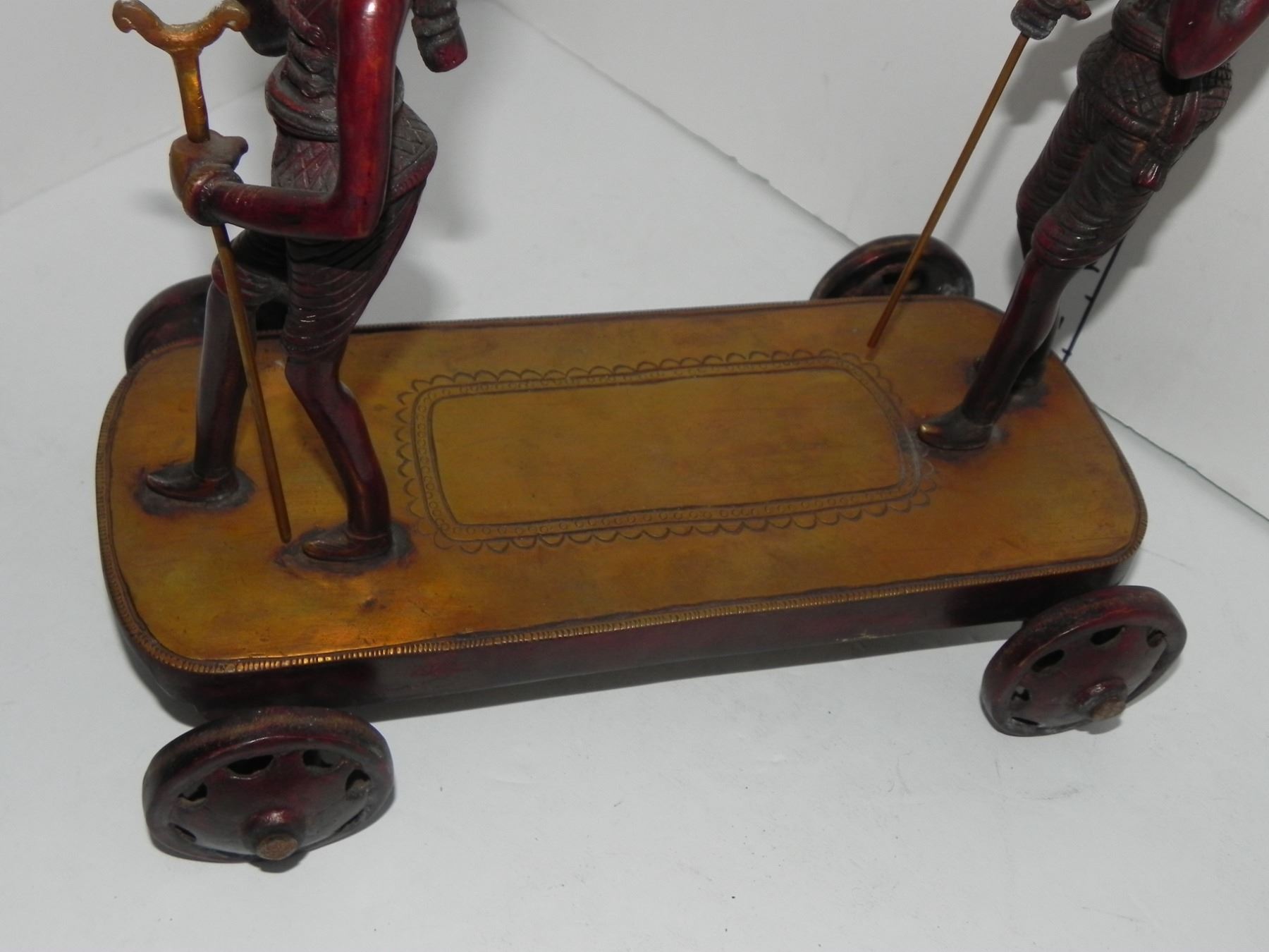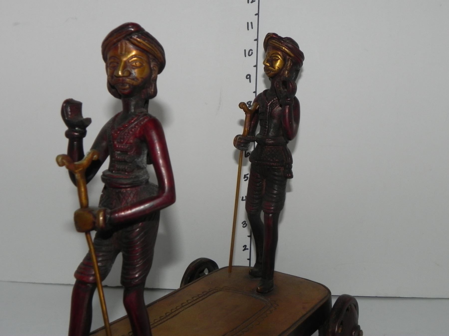 HEAVY ANTIQUE BRASS? TOY. VERY VERY HEAVY. ROLLS SMOOTHLY. THE STATUES ARE PERFECT. THEY TOO ARE MADE OF BRASS OR CAST IRON. NO MARKINGS. SEE ALL PICTURES