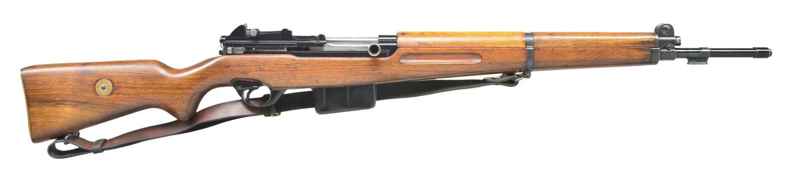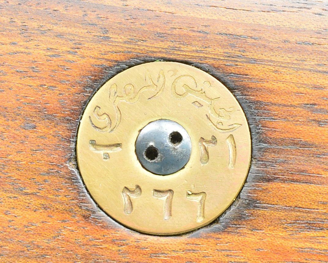 Cal. 8mm Mauser. S #16374. Back left of top cover has mismatch Arabic S # other parts unnumbered. Bbl. 23". Top of receiver marked w/ Egyptian crown. Right side of receiver marked w/ Belgian proofs. Left side of receiver marked w/ both English and Arabic S #'s. Left side rail marked "FABRIQUE NATIONALE D"ARMES DE GUERRE HERSTAL BELGIQUE". Tangent aperture rear sight w/ Arabic graduations. Blade front sight w/ protective ears. Bayonet lug is present. Walnut stock set . Brass disc w/ Arabic markings. Brass buttplate w/ trap. Bottom sling swivels w/ original black leather sling. CONDITION: lightly refinished walnut stock w/ added varnish, a few small filler repairs and scattered handling marks. Bolt body is silver pewter w/ light oxidation. Other metal parts retain 95% repainted black finish w/ some light flaking and handling wear. Fair bore showing scattered frosting and light pitting. (22-2474/MJC). CURIO. $500-800.