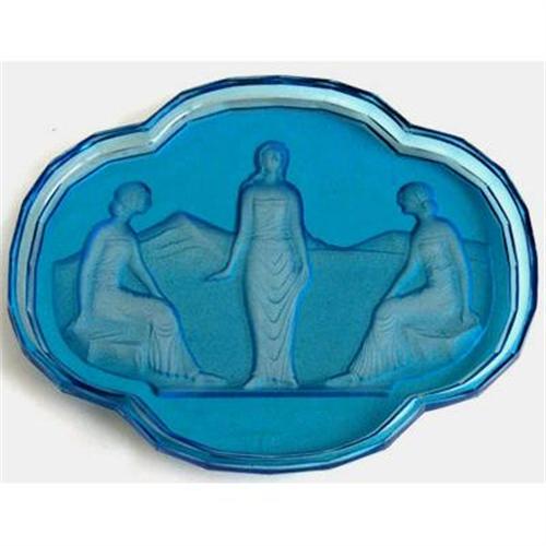 From the vanity set known as ?Egyptian? this fabulous turquoise blue Art Deco vanity tray was produced in Bohemia during the 1930s and features an intaglio image of three young ladies posing in front of desert sand dunes. With a scalloped rim and gorgeous shape it measures 10 ½? x 9? and is in excellent condition.