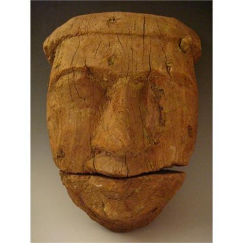 Late Period, 29th Dynasty. The wooden facial portion from a sarcophagus with handsome features . Carved from a solid piece of cedar wood, the features are rendered in a sensitive style with removable mouth , a narrow bridged nose. Some minor weathering, but a very handsome and H:11 1/8" x 28.3 cm) x W: 8 1/8"(20.8 cm) x D :3 1/4" (8.2 cm)