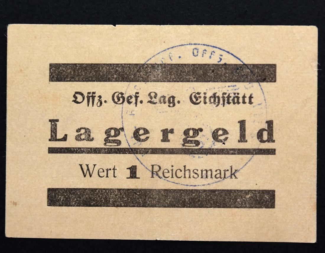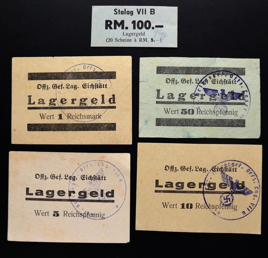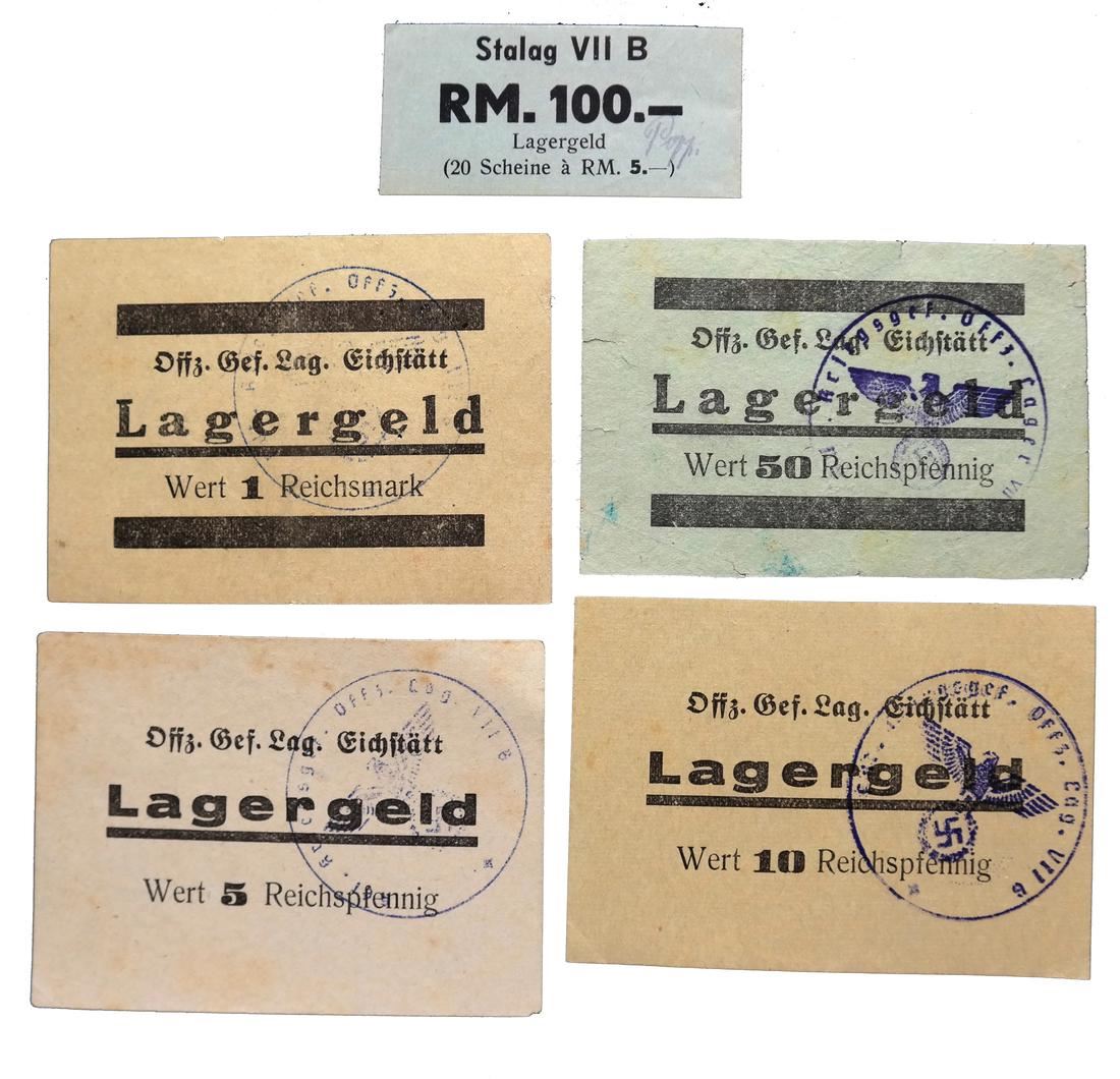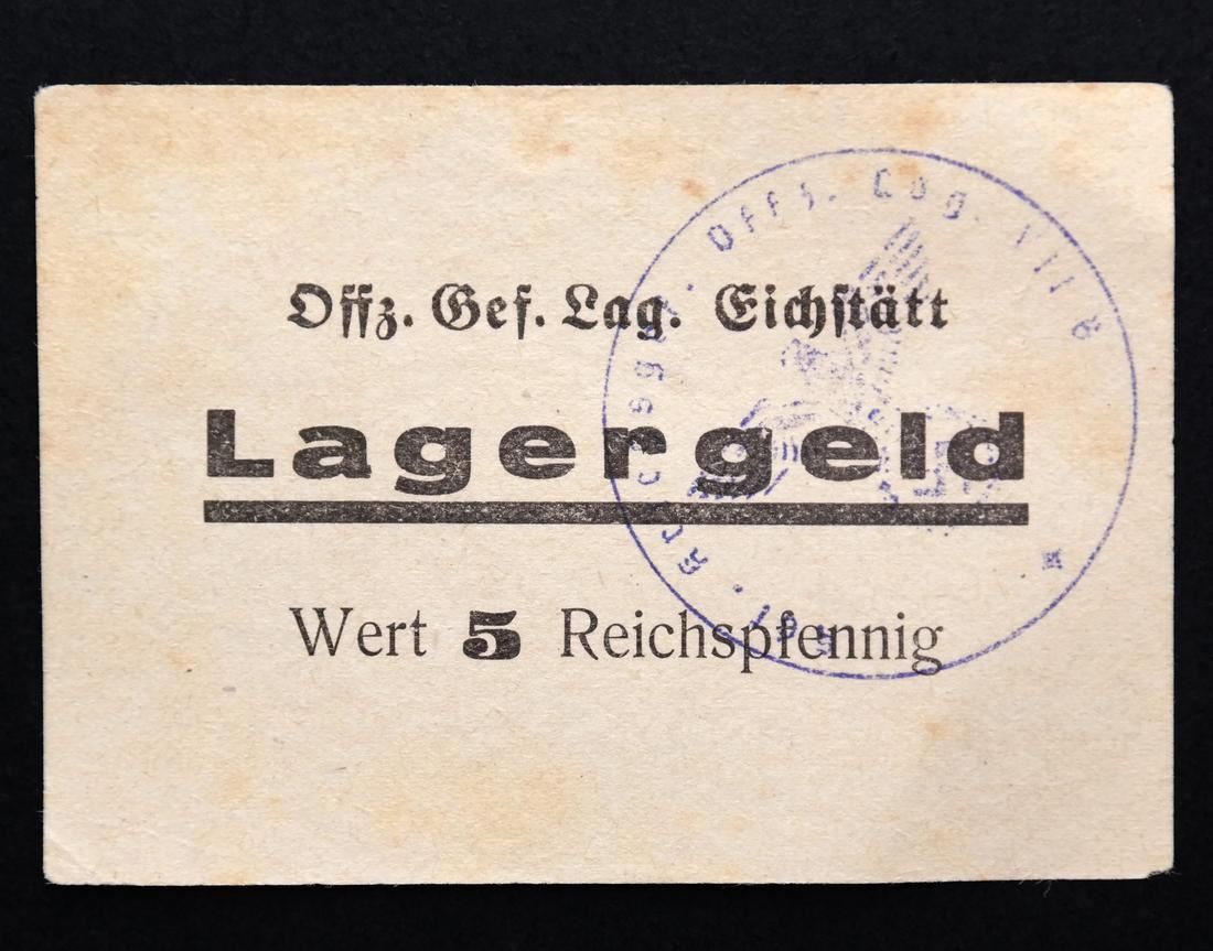 Offz. Ges. Lag. Eichsttt / Lagergeld 5rpf, 10rpf, 50rpf and 1RM notes with violet Lag. VII B control handstamps, the 5rpf and 10rpf are Extremely Fine to About Uncirculated, the 50rpf has edge tears and tone spots, Fine, and the 1RM has creases and a pinhole, VF, also includes a wrapper for 5RM notes.