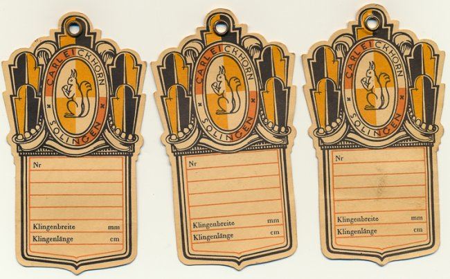 A fine items for the Eickhorn collector, a set of three periof Eicklhorn sword tags, each 4" long, printed with the Eickhorn squirrel and with space for the sword number, length, width, etc. Unused.