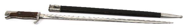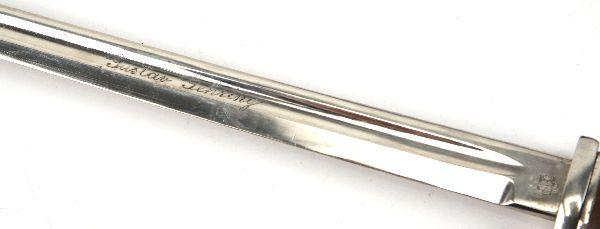 Imperial German M-98 Quillback bayonet with leather scabbard from Carl Eickhorn. 20 inch fullered blade engraved Gustav Gehring. Very good condition.
