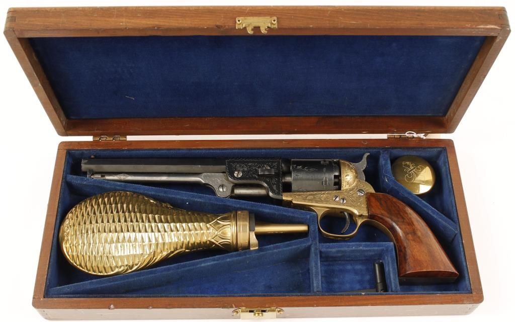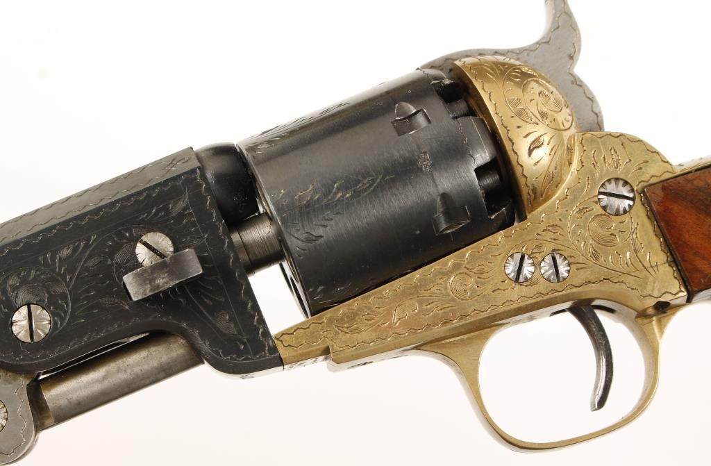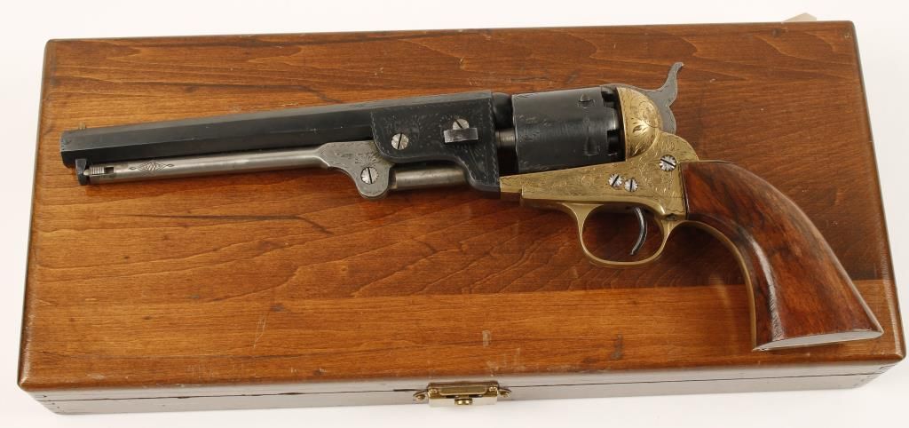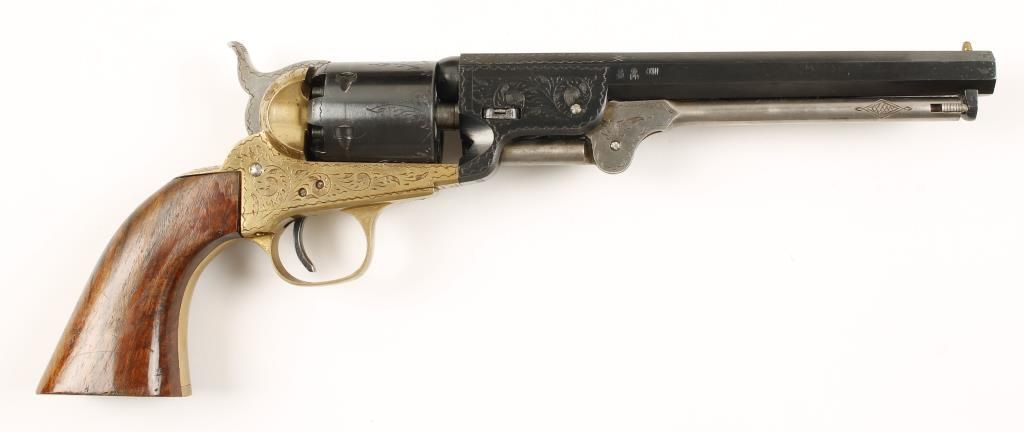 Cased engraved replica black powder single action 6-shot percussion pistol. Blued 7-1/2" octagon barrel. Case colored loading lever, hammer and trigger. Blued cylinder. Brass frame, trigger guard and backstrap. Not cut for a shoulder stock. Lined hardwood case with loading and maintenance tools. Condition is very good. *Antique Firearm*