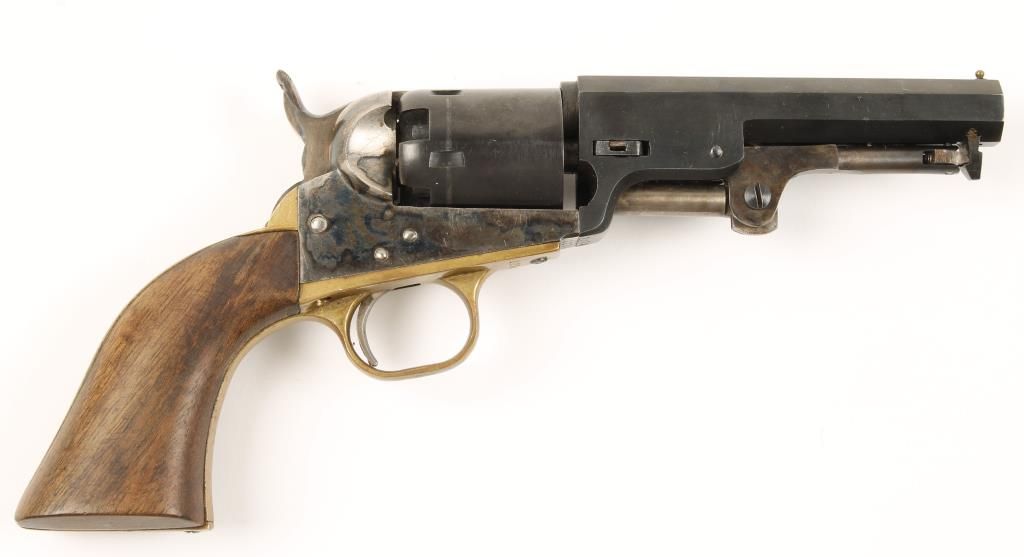 Replica black powder percussion 5-shot pistol. 4" octagon barrel with loading lever. Color case hardened loading lever, short frame, hammer and trigger. Brass trigger guard and back strap. Some scratches and blemishes to the frame. Very good bluing on the barrel and cylinder. Condition is good. *Antique Firearm*