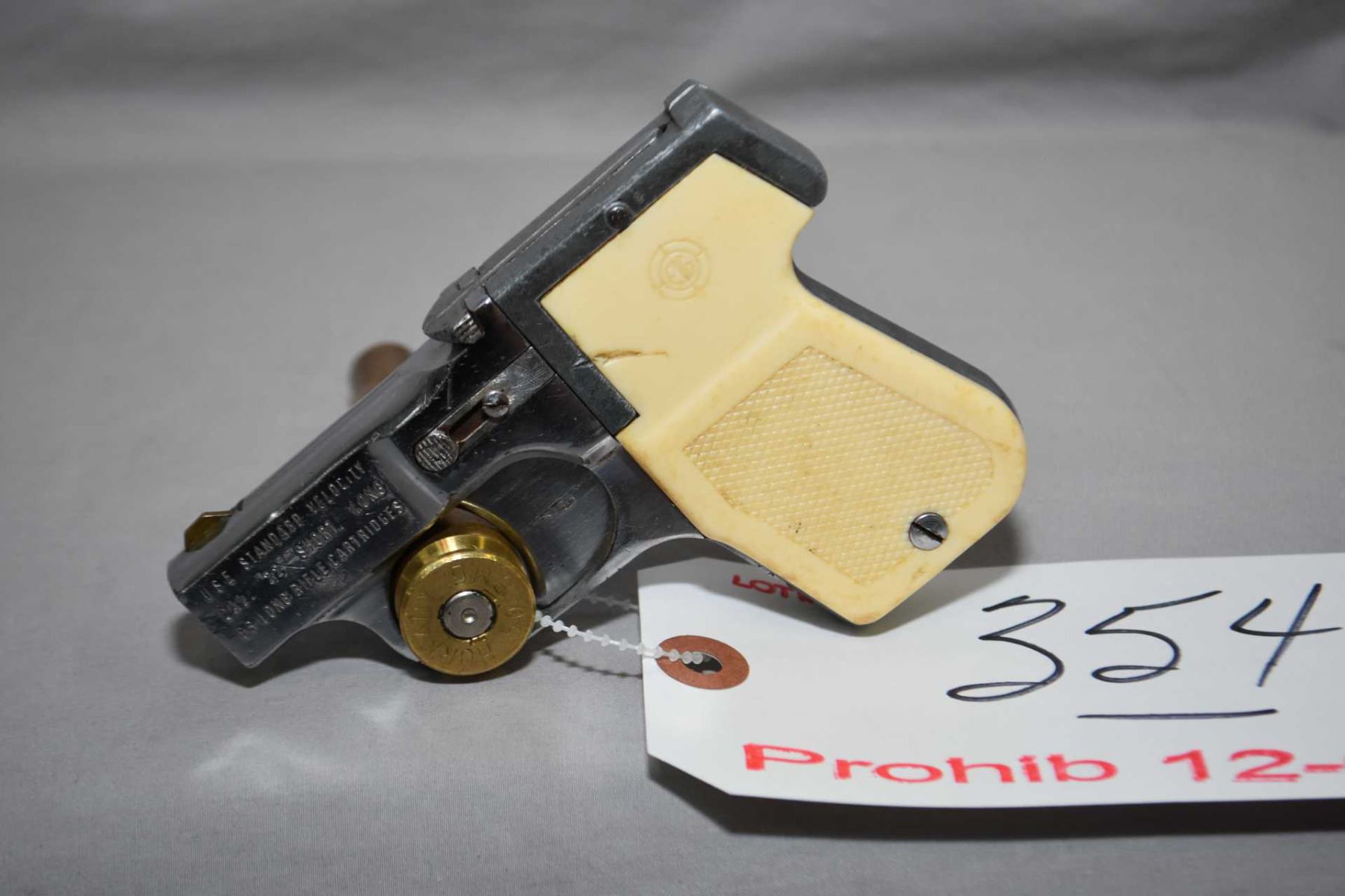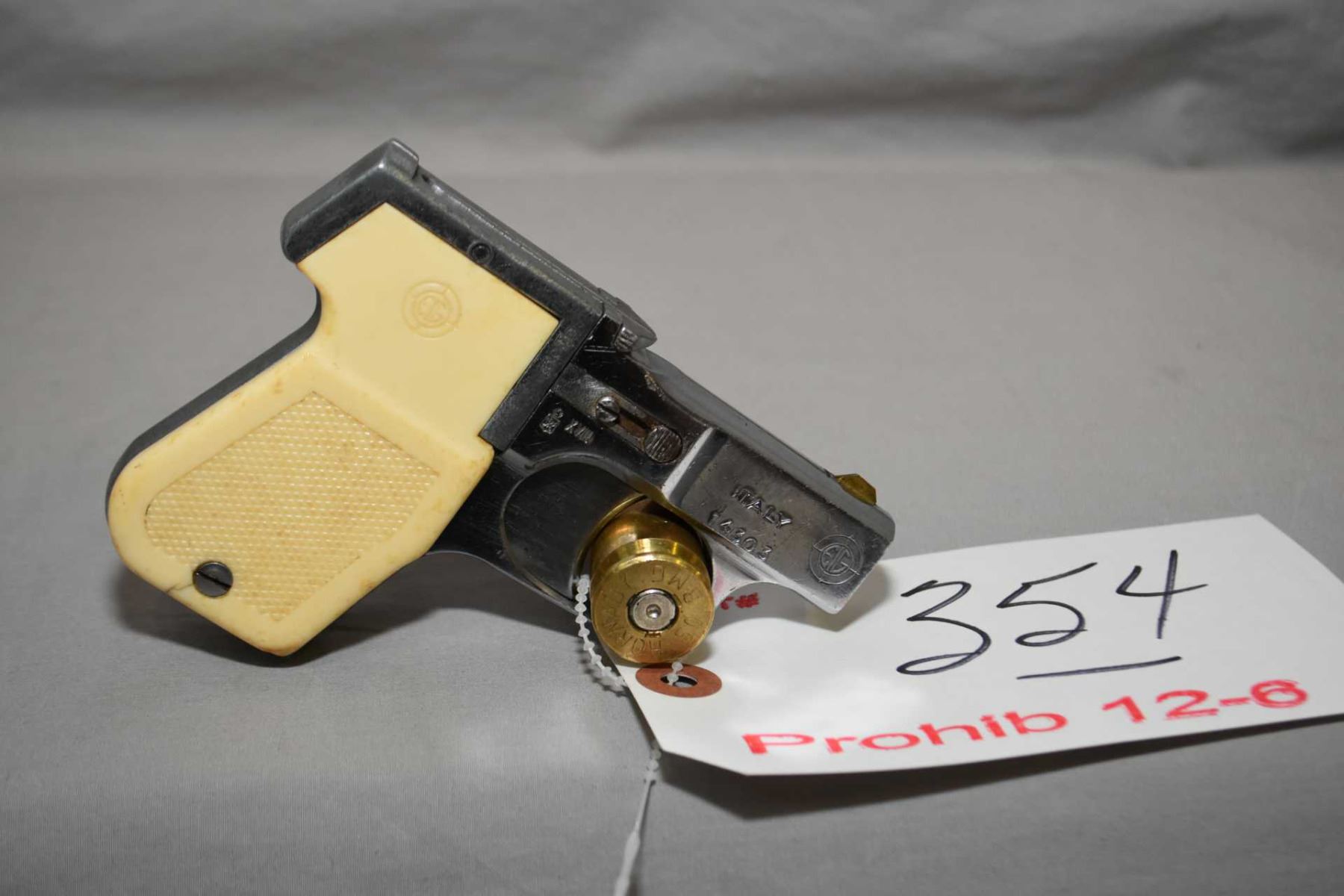 EIG ( Tanforglio, Giuseppe) Model Derringer 4 Barrel .22 LR Cal 4 Shot Multi Barrelled Pistol w/ 63 mm bbl [ nickel finish, starting to fade and some flaking, white checkered plastic EIG grips with age cracks by screws ] Ser # 14303 Prohib 12 - 6 Cert # 13250045 FRT # 23873 - 1
