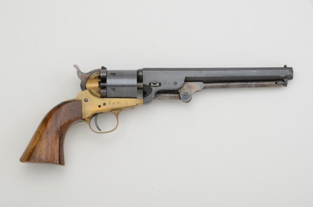 EIG modern copy of a Colt Navy conversion, .36 cal., 7-1/2” barrel, blue finish with brass frame, wood grips, #32649. This gun is in overall very good condition with the majority of its original finish, good bore,action and grips. From an old estate. Est.: $175-$325.