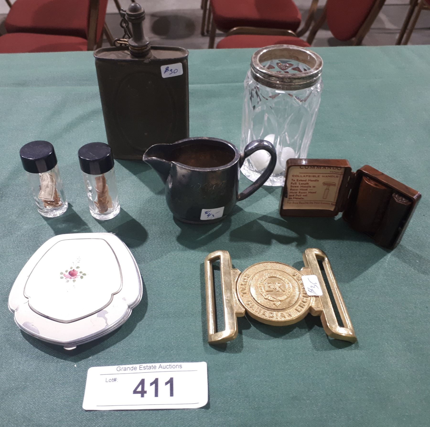 COMPACT, ARMY BELT BUCKLE, GUN POWDER FLASK ETC