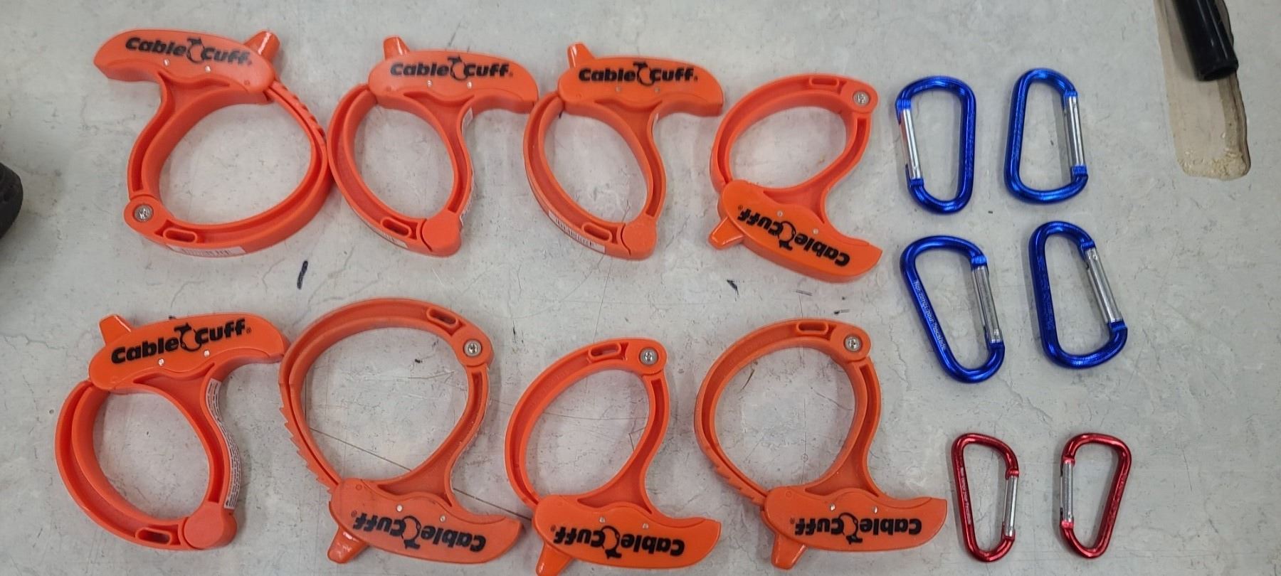 EIGHT CABLE CUFFS AND SIX CARIBEANERS