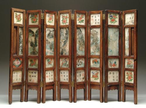 EIGHT FOLD PAINTED STONE AND WOOD ORIENTAL TABLE SCREEN. Each panel divided into four separate panels, which have painted stone inserts. Most depict people, some have writing. Appears to be 19th Century. SIZE: 25in.. Each panel is 4-3/4in. w. CONDITION: Some paint loss but generally in good condition. 9-26362