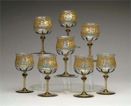 EIGHT MOSER GOBLETS. Fantastic Moser goblets are decorated with gilt flowing leaves and swirls creating four medallions around the goblet. Each medallion is decorated with lady in flowing gown. The bottom of each goblet bowl has eight applied rippled blue traceries. The amber stem has applied blue beads surrounding the top. Each goblet is signed on the underside in script "Moser". SIZE: 5-3/4 in. t. CONDITION: Very good to excellent. Collection of Dr. C. and Margaret Chastain 5-61441