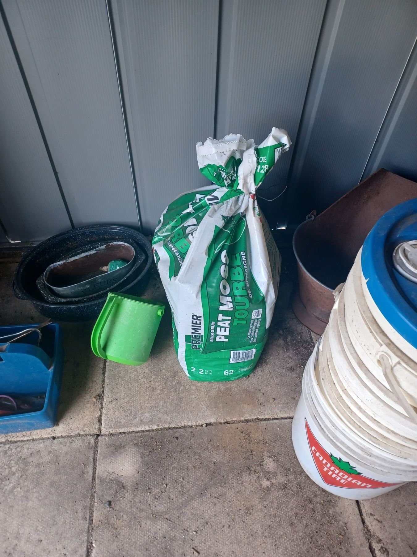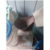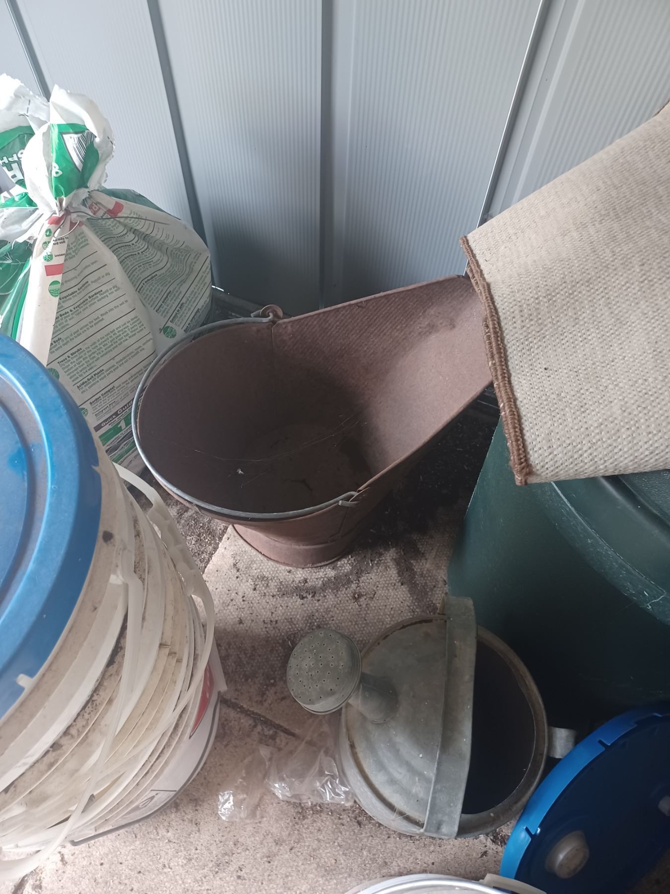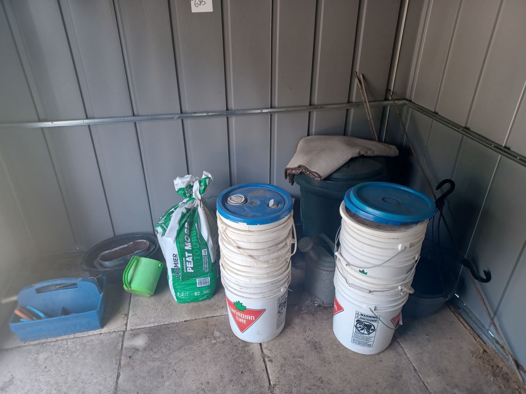 EIGHT PAILS, METAL WATERING CAN, HANGING PLANTERS, GARBAGE CAN, GARDENING TOOLS. PLEASE SEE IMAGES F