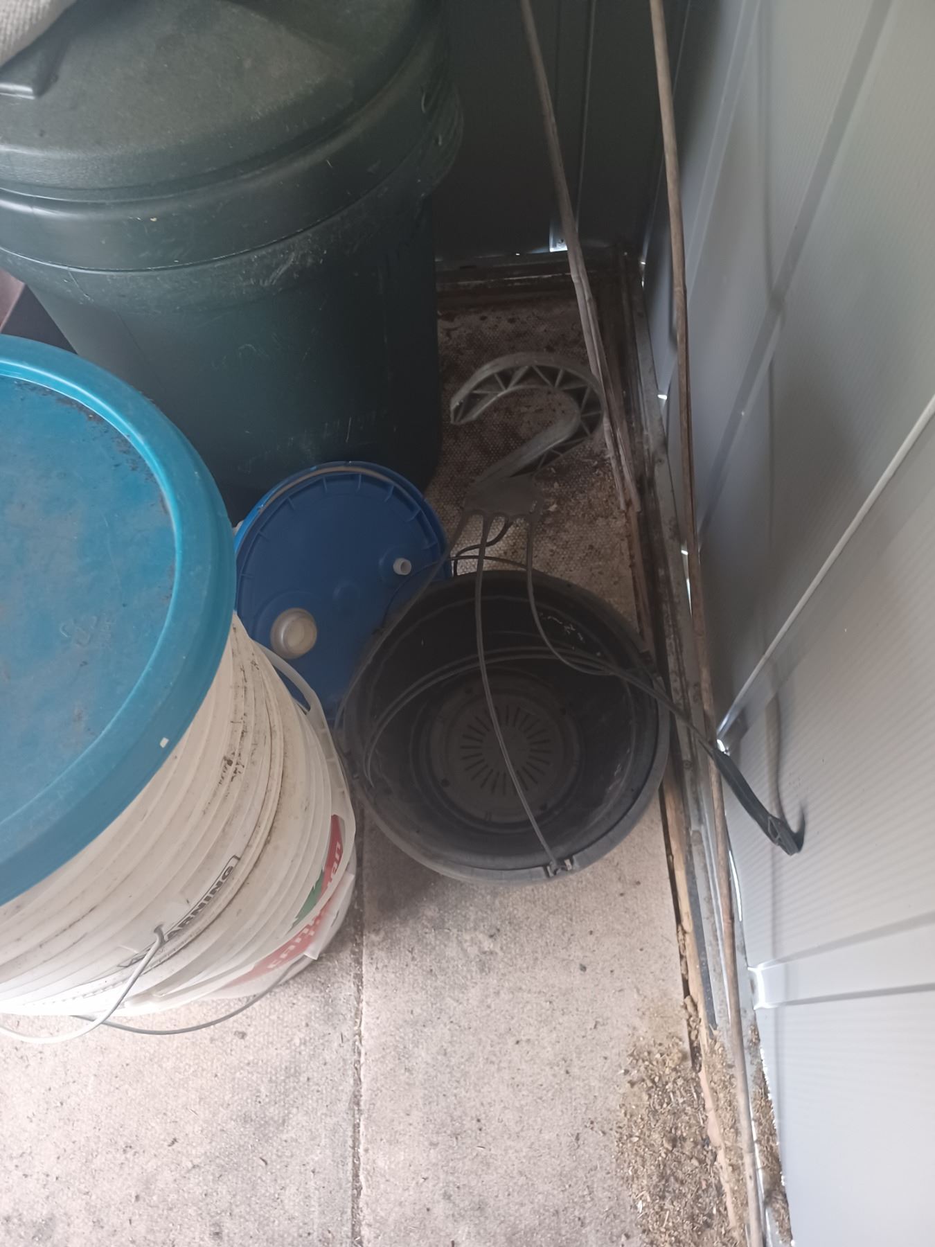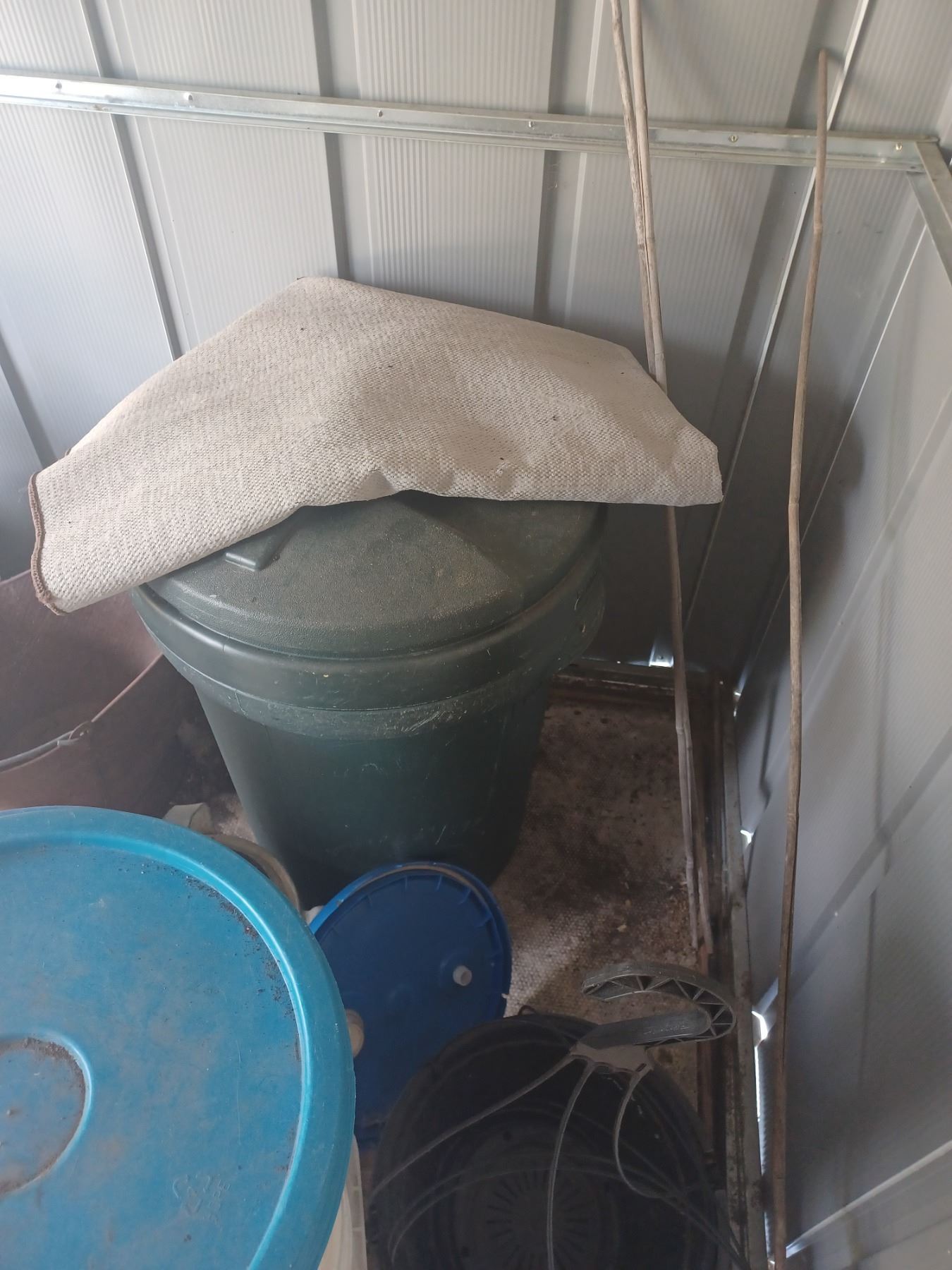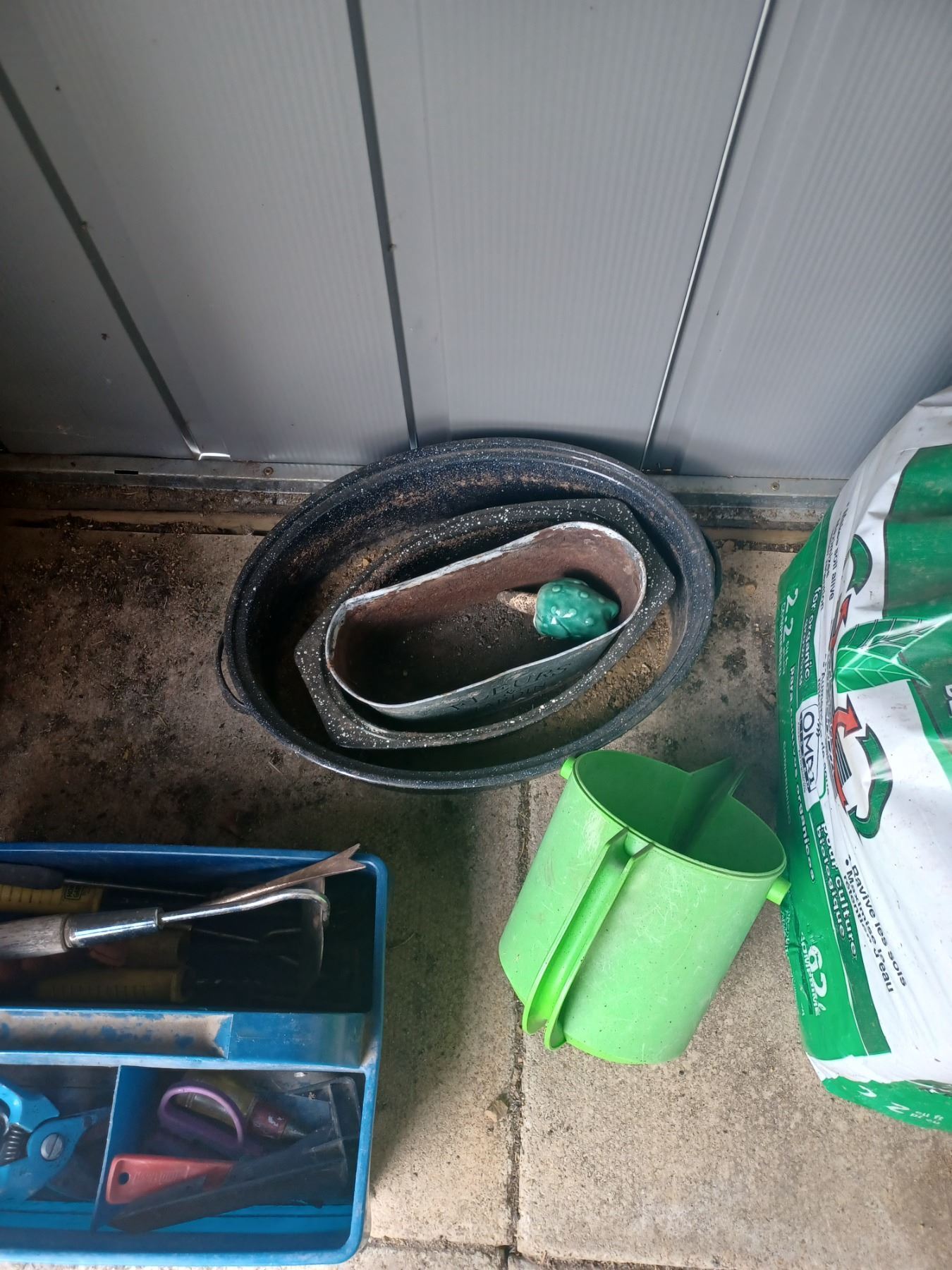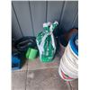 EIGHT PAILS, METAL WATERING CAN, HANGING PLANTERS, GARBAGE CAN, GARDENING TOOLS. PLEASE SEE IMAGES F