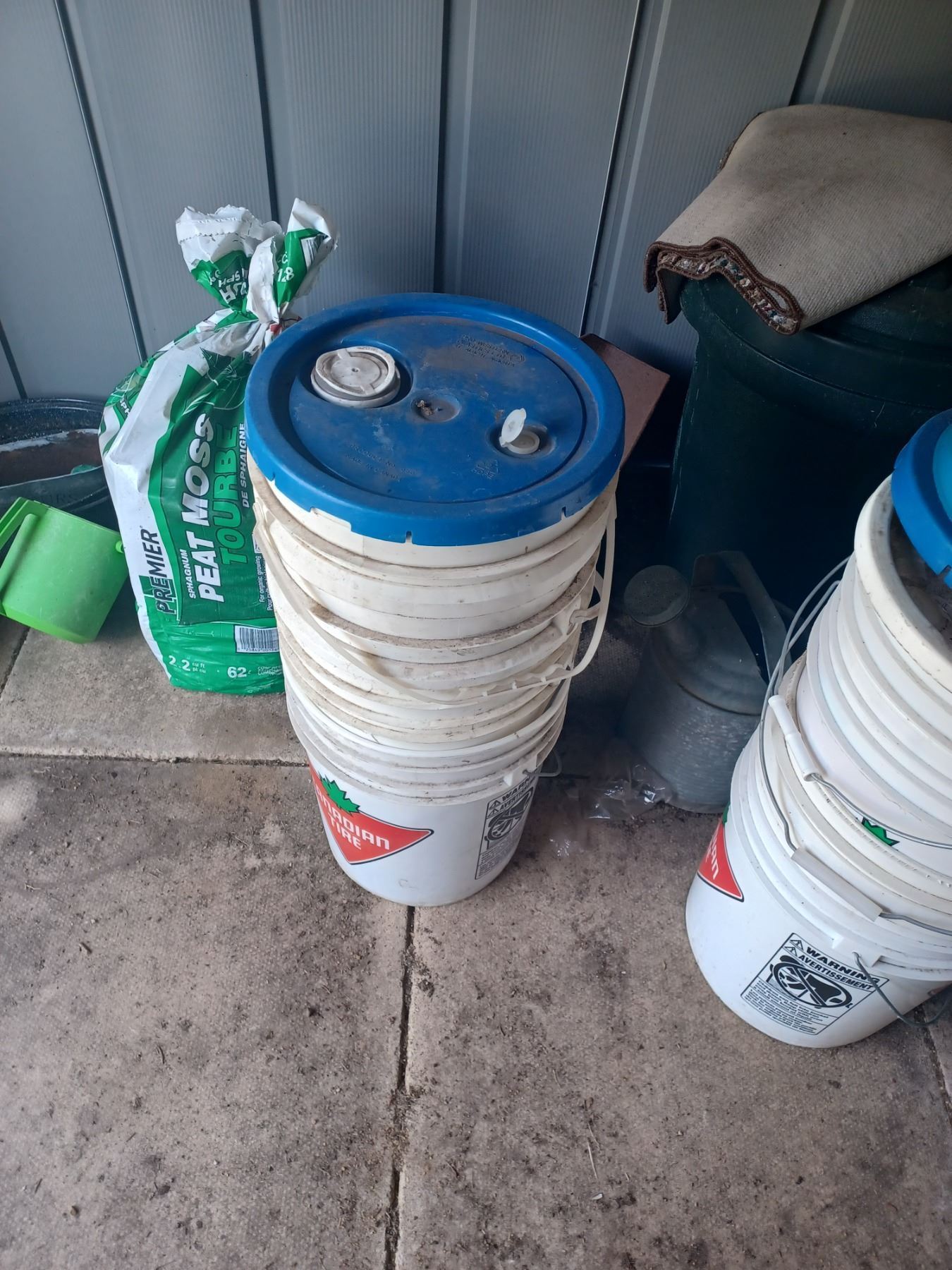 EIGHT PAILS, METAL WATERING CAN, HANGING PLANTERS, GARBAGE CAN, GARDENING TOOLS. PLEASE SEE IMAGES FOR MORE INFO