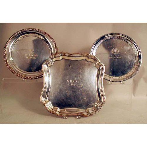 EIGHT SILVER PLATED CIRCULAR TROPHY TRAYS<BR><BR>Together with a circular covered vegetable dish