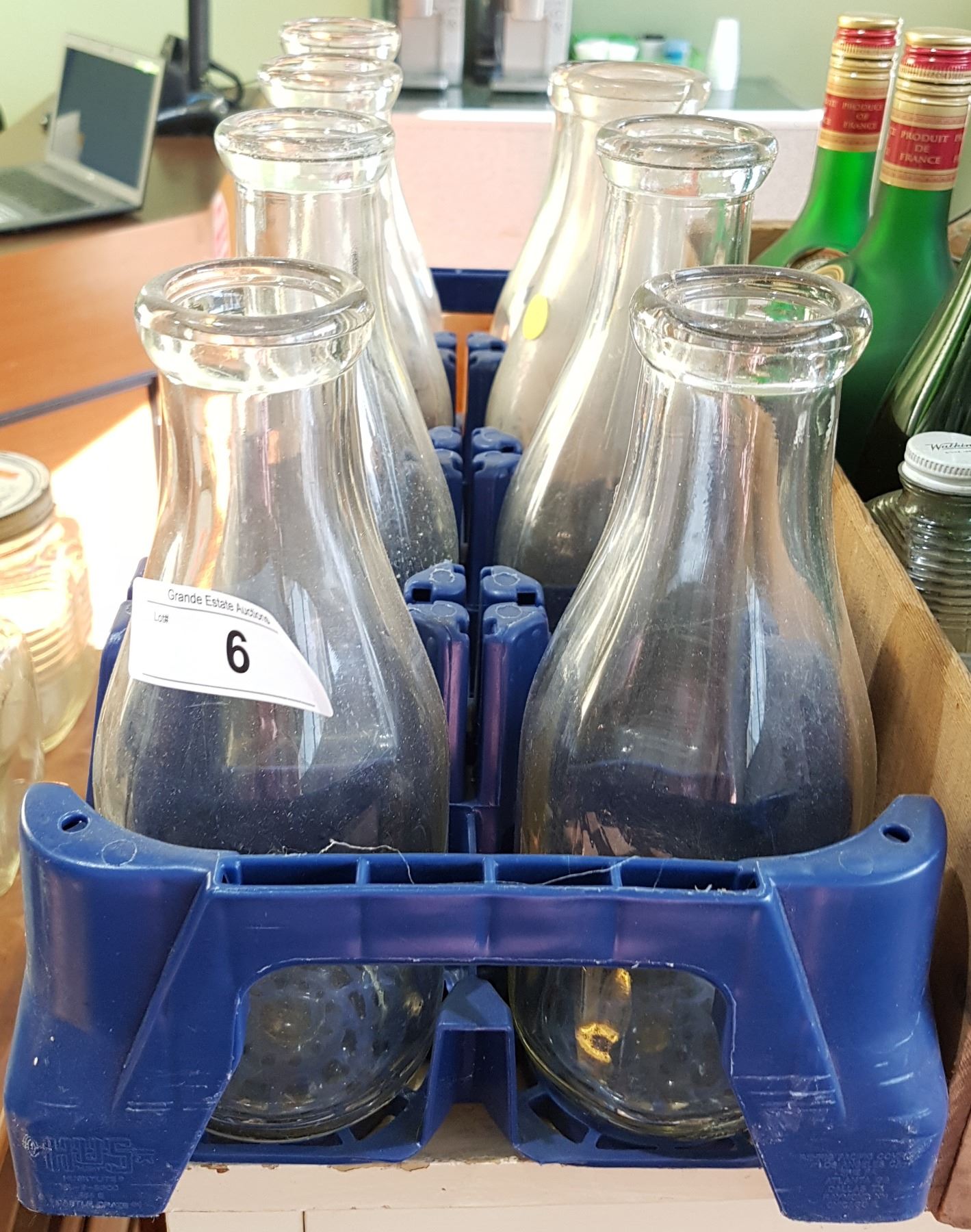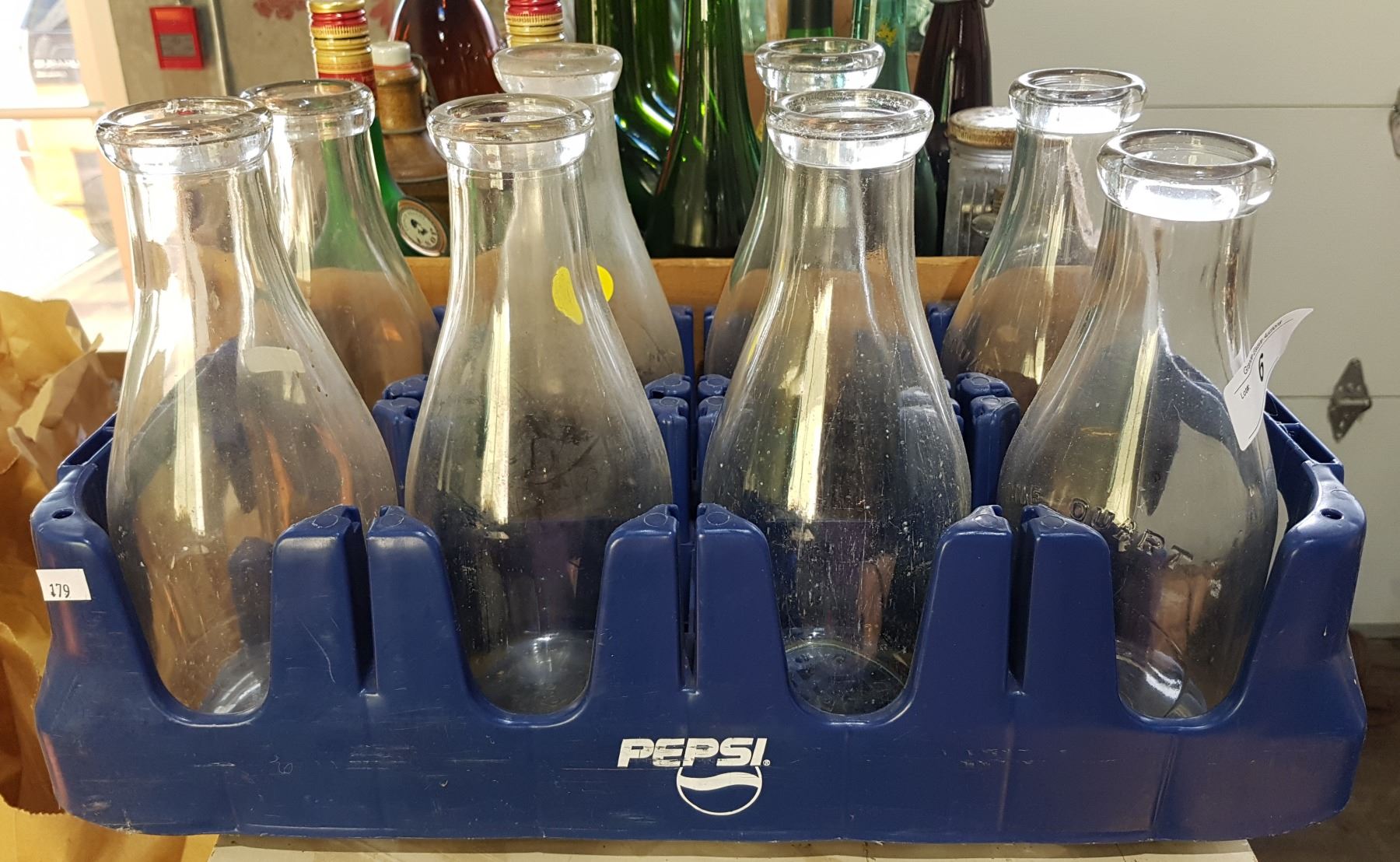 EIGHT VINTAGE MILK BOTTLES IN PEPSI CRATE