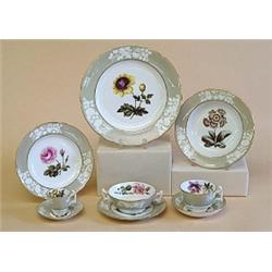 English. 20th Century. "Botanical" pattern. Comprising: eight dinner plates, eight salad plates, eight bread and butter plates, eight soup plates, seven cream soups and stands, six coffee cups and saucers, eight tea cups and saucers, covered vegetable, covered tureen and stand, two platters, two serving bowls, tea pot, sugar and creamer. $1,000/1,500