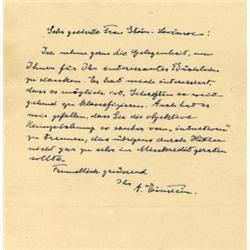 <b>247. ALBERT EINSTEIN</b> Fine content A.L.S. "<i>A. Einstein</i>" 1p. 8vo., Saranac Lake, Sep. 4, 1942 in German to pioneering graphologist Thea Lewinson commenting on her exhaustive study of handwriting characteristics. In part: <i>"...I would like to take this opportunity to thank you for your interesting little book. It was interesting to me that it is possible to classify handwriting in such an exhaustive manner. I also appreciate that you were able to separate out so clearly the objective characteristics from the purely intuitive which theory, by the way, would not be much discredited in the case of Hitler...</i>". Lewenson herself had fled Hitler's oppressive regime in Berlin. Fine, with transmittal envelope signed by his wife Margaret.<b> $3,000-4,000</b>