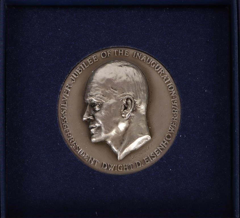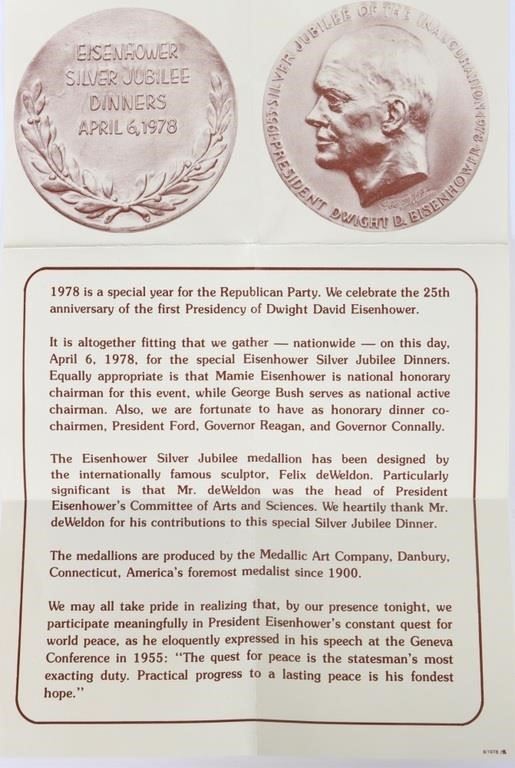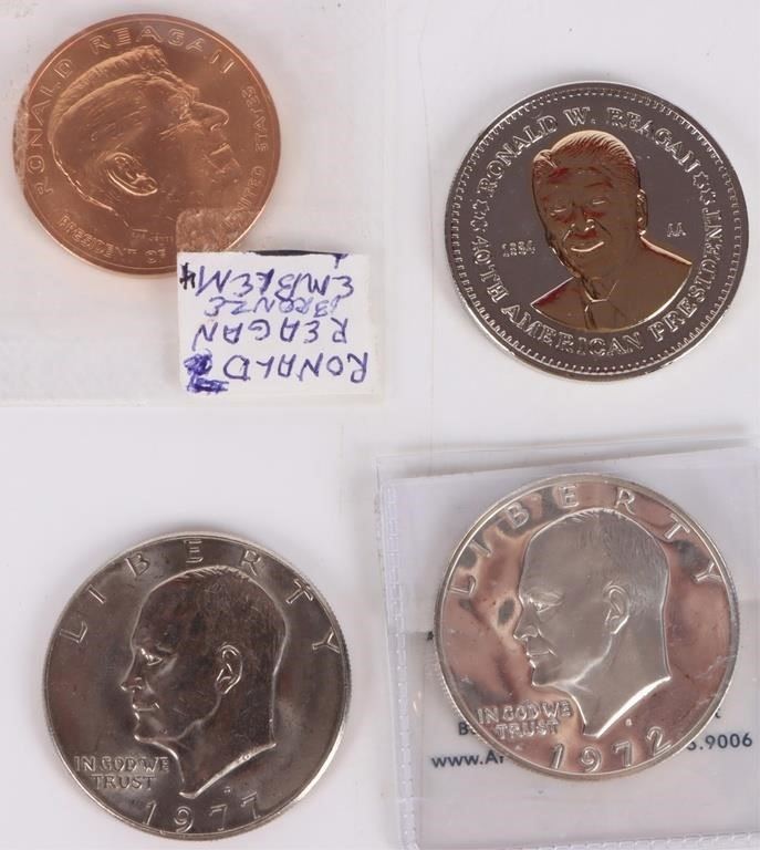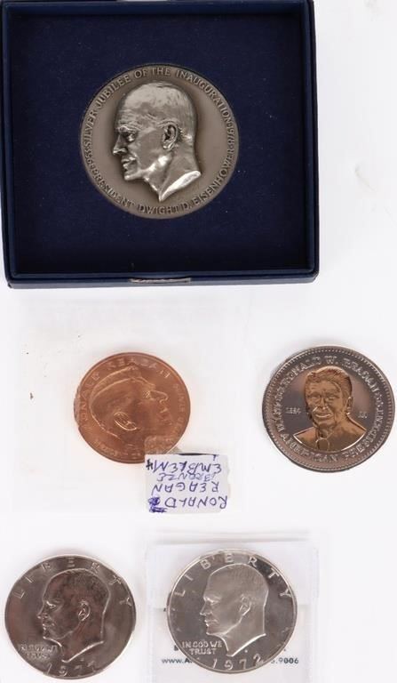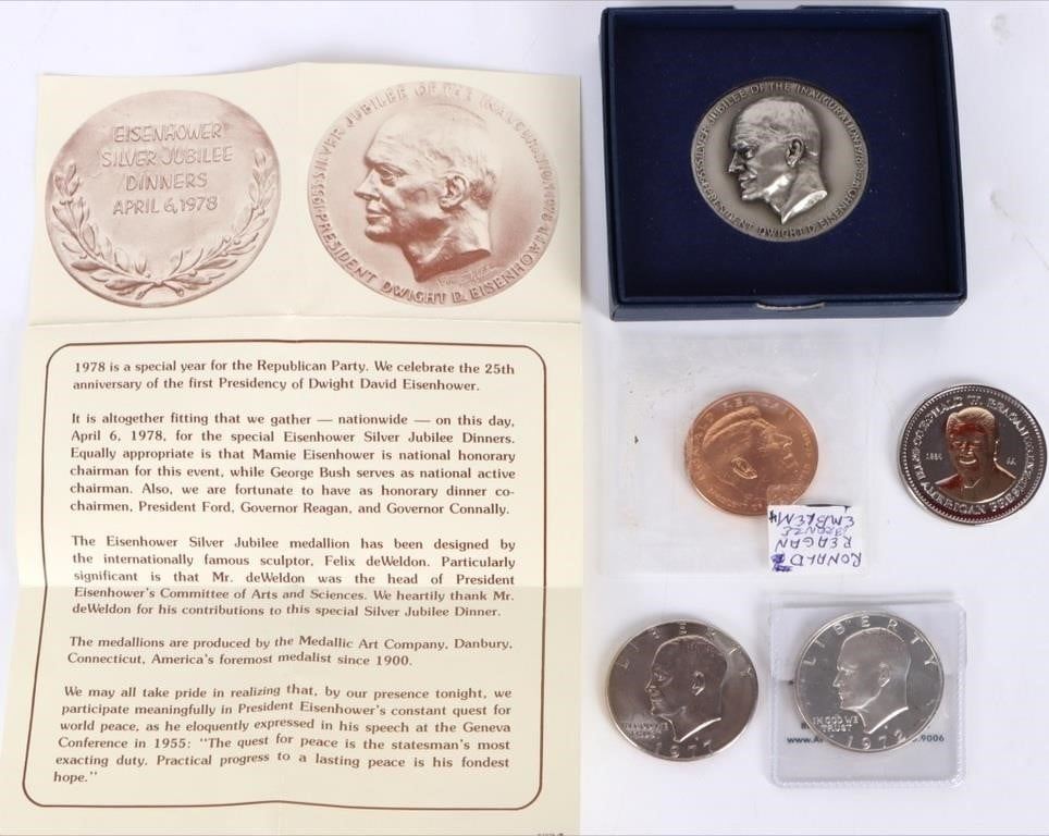 Eisenhower and Ronald Reagan collector's coins to include one mint 1974-1776 40% silver Eisenhower dollar, one 1977 Eisenhower dollar, one Eisenhower silver Jubilee Dinners commemorative coin, one Ronald Reagan 1984 presidential commemorative coin, and one Reagan inauguration coin copper.