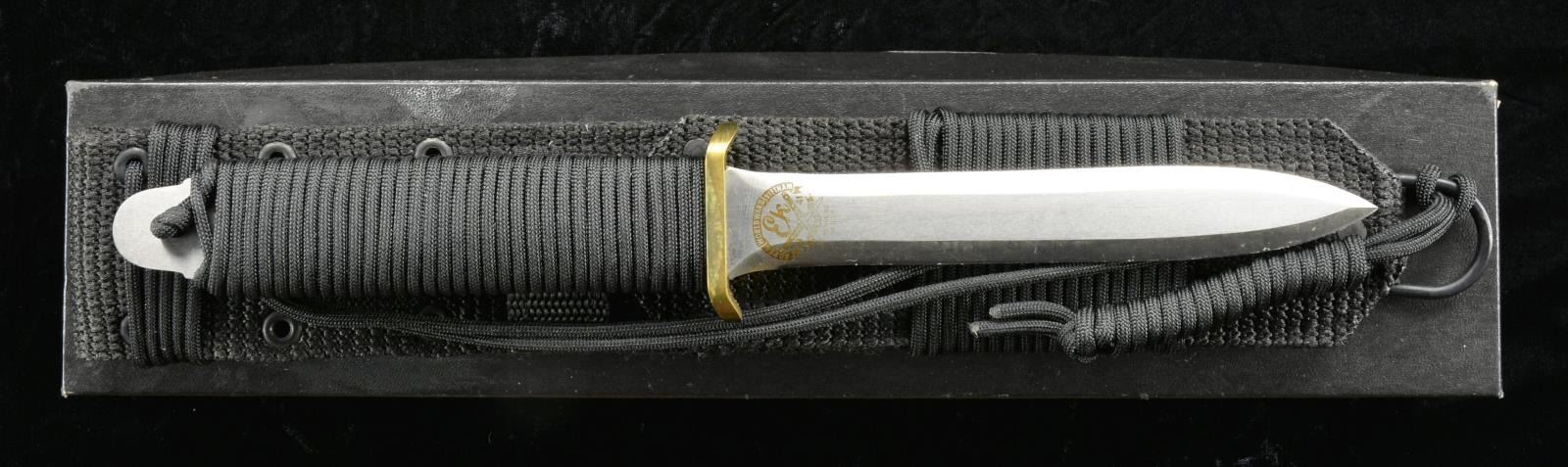 Mfg. in the 1980's in Richmond, VA before the Gulf War. Commando style 12 1/2" knife w/ 6 1/2" spear point double edged blade. Brass crossguard. Black cord wrapping around tang. UNATTACHED ACCESSORIES: box & black nylon scabbard w/ parachute cord. CONDITION: near excellent. (02-16746/MD). $40-60.