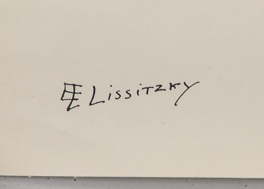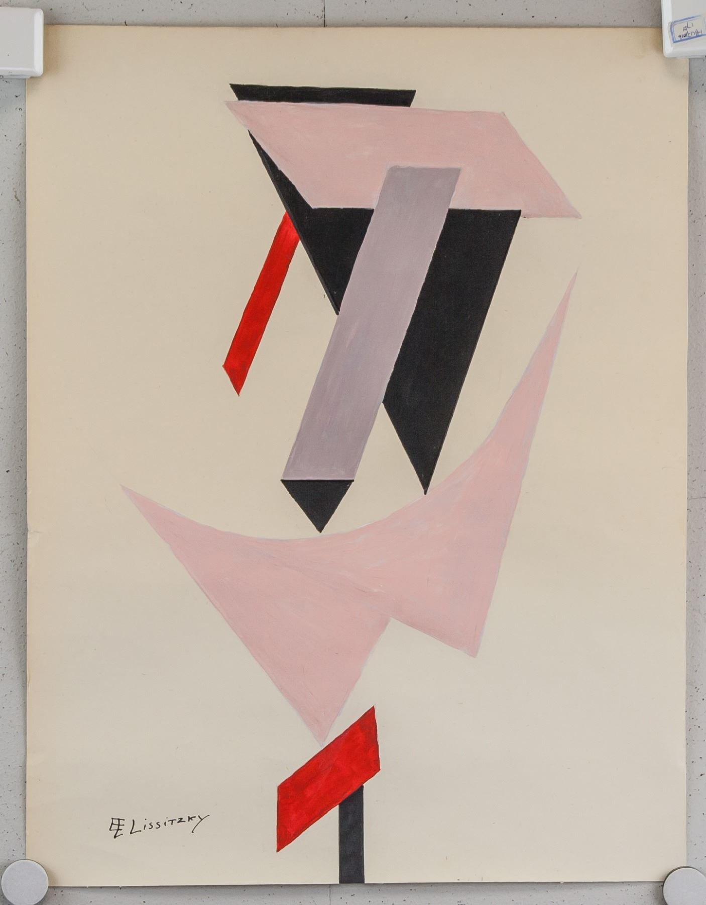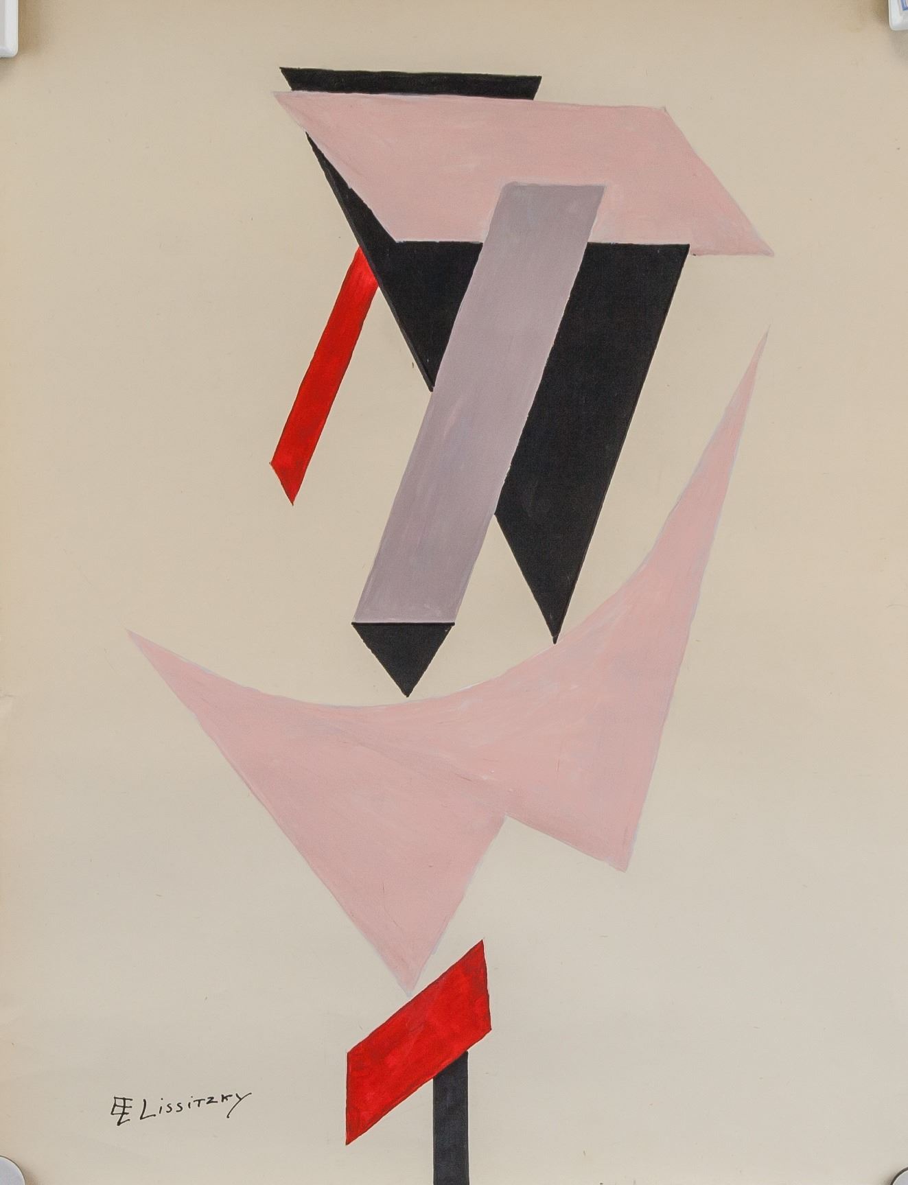 Gouache on paper. Abstract composition. Signed and attr. El Lissitzky (Russian, 1890-1941). 46 x 35.5 cm (18.1 x 14.0 in.) El Lissitzky was an avant-garde Russian artist and major figure in both Suprematism and Constructivism. Lissitzky’s politically fueled poster designs, photographs, and paintings melded formal abstraction with typography, as seen in his Proun series. “The artist constructs a new symbol with his brush. This symbol is not a recognizable form of anything which is already finished, already made, already existing in the world,” he once mused. “It is a symbol of a new world, which is being built upon and which exists by way of people.” Born Lazar Markovich Lisitskii on November 23, 1890 to a Jewish family in the small village of Pochinok, Russia. Much of his childhood was spent in Vitebsk, where he studied art from a young age under Yehuda Pen, who also taught Marc Chagall. In 1909, Lissitzky moved to Germany to study architecture at the Technische Universität in Darmstadt. At the outbreak of World War I, he and other Russian emigres were forced back to Russia. After the 1917 Russian Revolution, Lissitzky became involved with the newly formed Soviet government group Inkhuk (Institute for Artistic Culture). His work for the institute included designing exhibitions for Constructivist shows and typographies for books by Vladimir Mayakovsky. Lissitzky died on December 30, 1941 in Moscow, Russia. Today, his works are held in the collections of The Museum of Modern Art in New York, the Tate Gallery in London, the National Gallery of Art in Washington, D.C., and the J. Paul Getty Museum in Los Angeles, among others.
