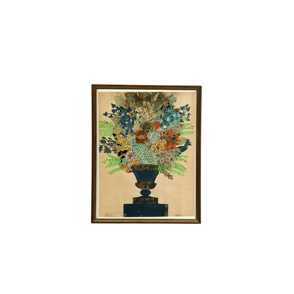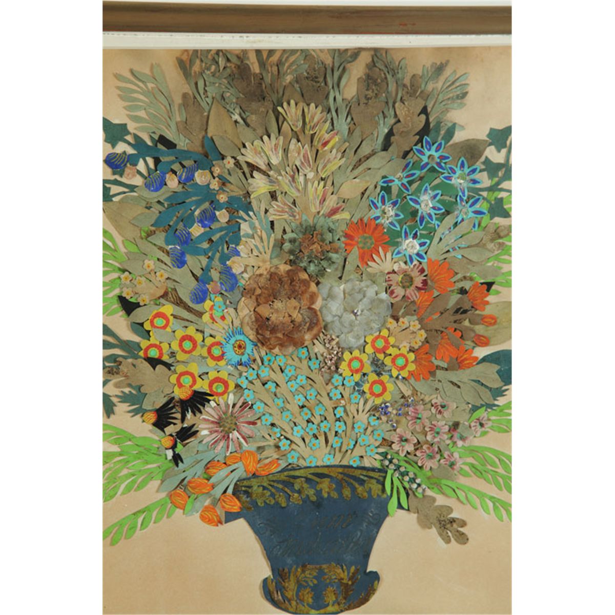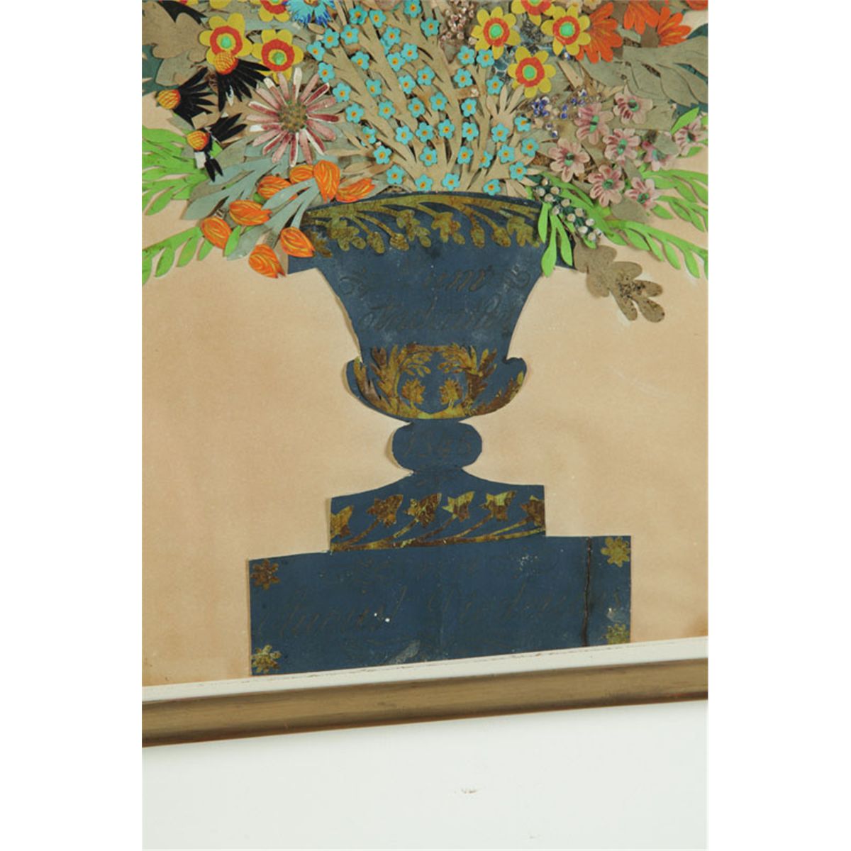 Possibly German, watercolor and paper and other materials mounted on paper. Urn with colorful flowers, and on the base "August Diederichs, 1845" with German text. Gold frame, 16 1/2"h. 13 1/4"w. Purchased at Clum Auctions (Ohio), reputedly from the Worthington family of Chillicothe, Ohio.