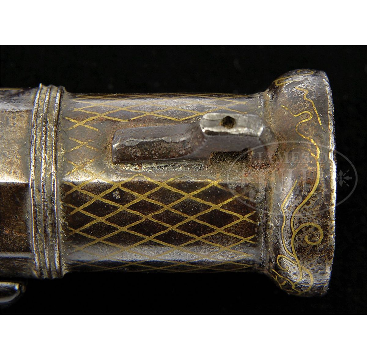 NSN. This light horseman's carbine has a heavy bbl, fully inlaid with zogan inlay in brass, copper and shibuichi with playful swirls amidst scrolling foliage and leaves, the cannon muzzle finely inlaid as well. Trigger guard inlaid en suite with bbl as is cock. Japanese red oak full stock is lacquered black. CONDITION: Inlay on bbl largely present but lightly rubbed. Cock is damaged but functional. Stock split out on ramrod channel. Cracked forward of pan, not serious. A desirable and scarce configuration, as most Tanegashima are long and thin. 4-49185 MRZ59