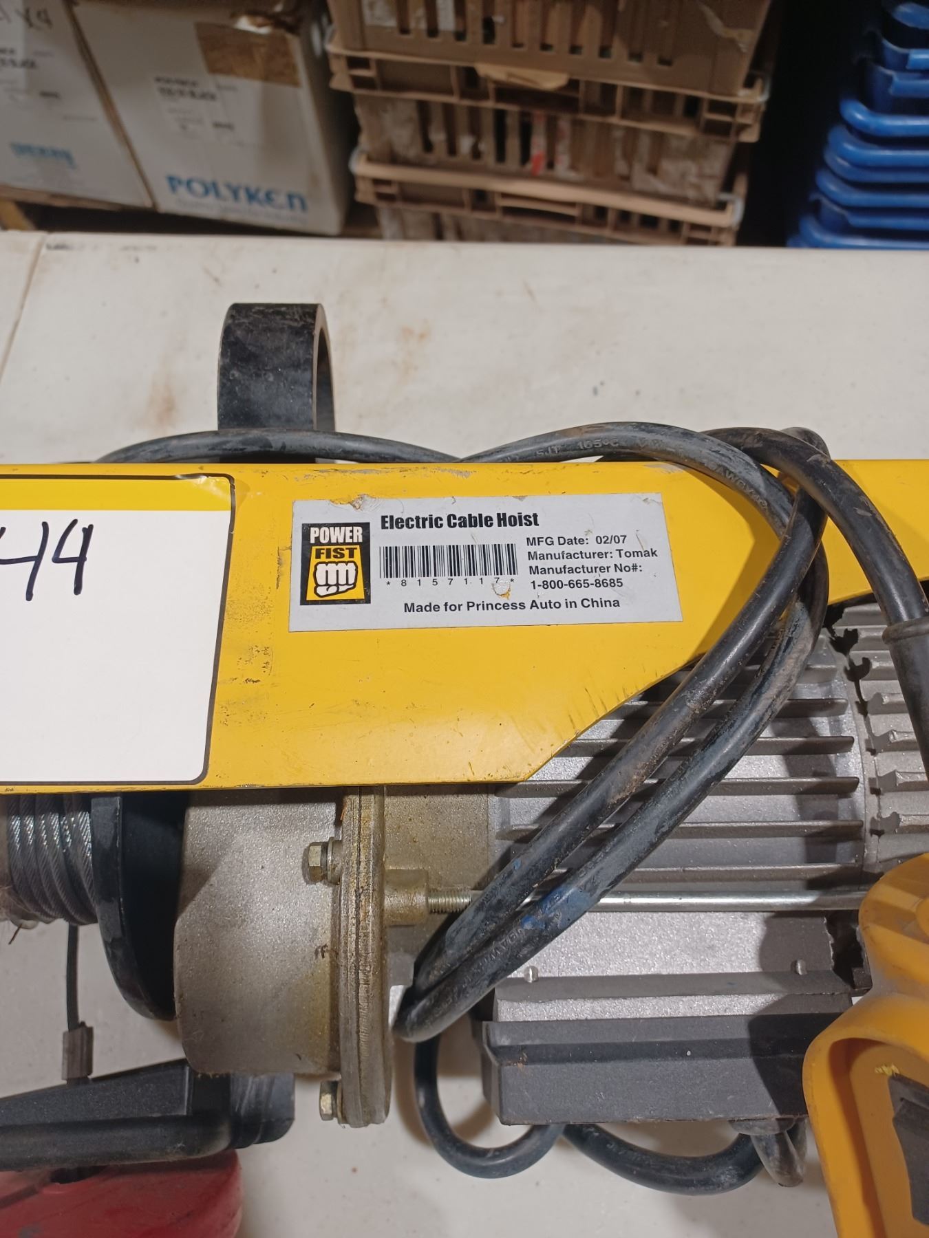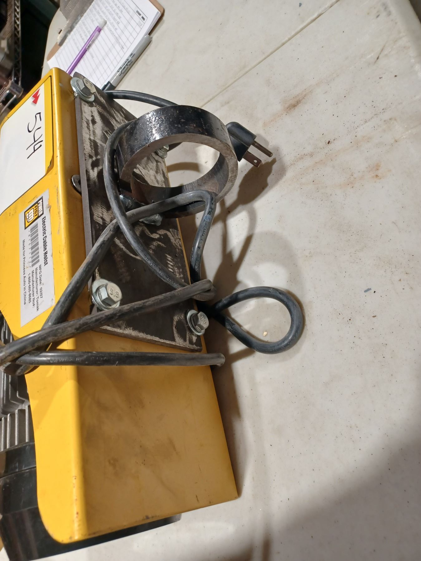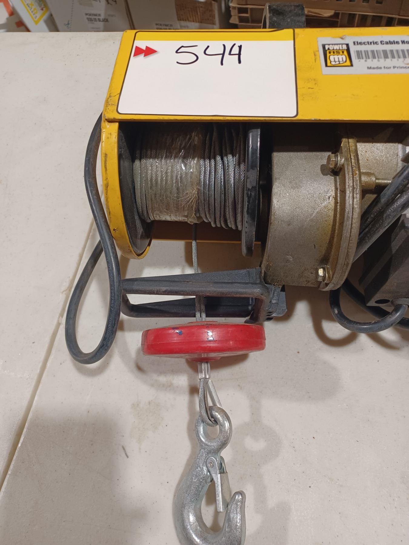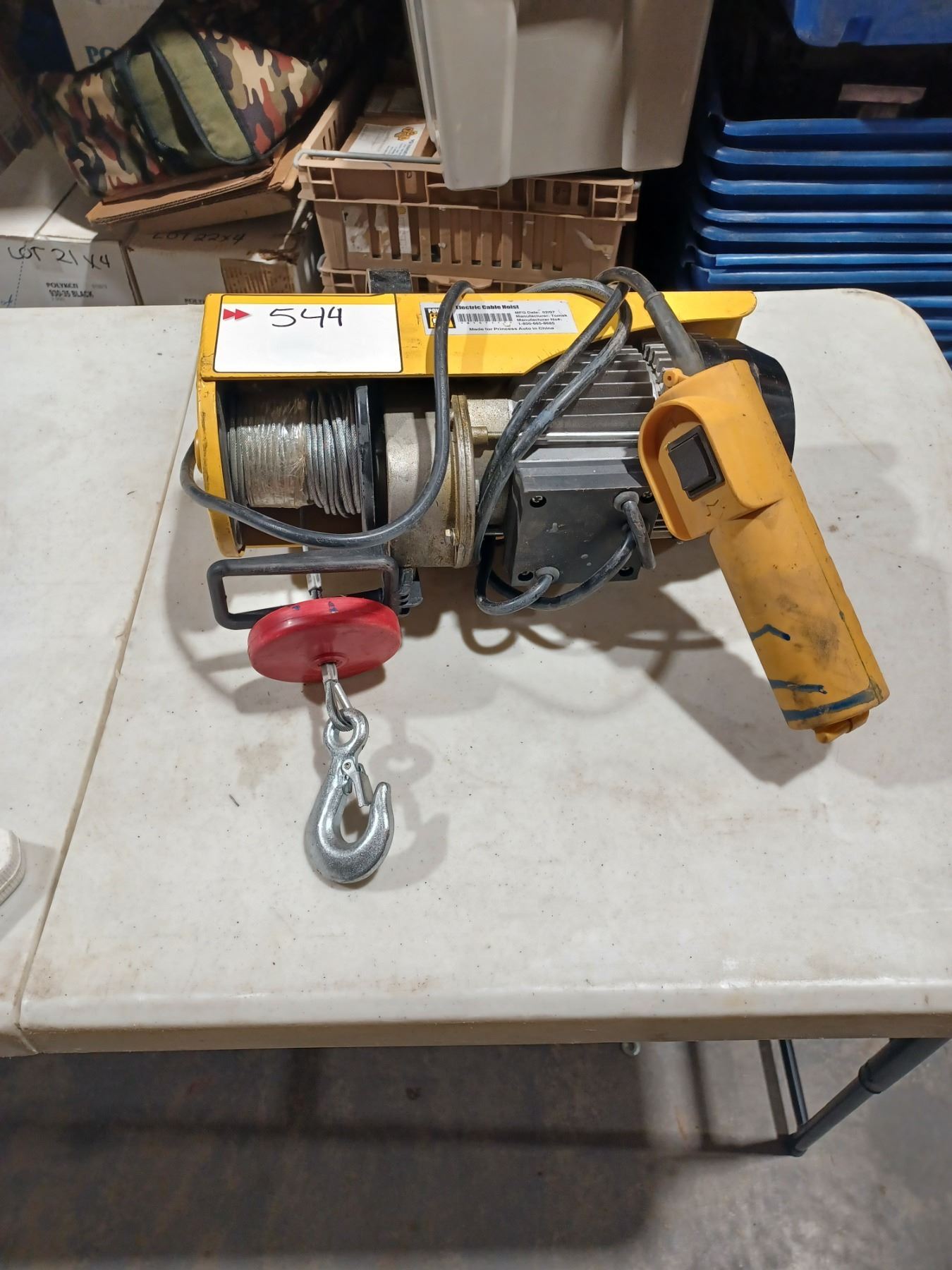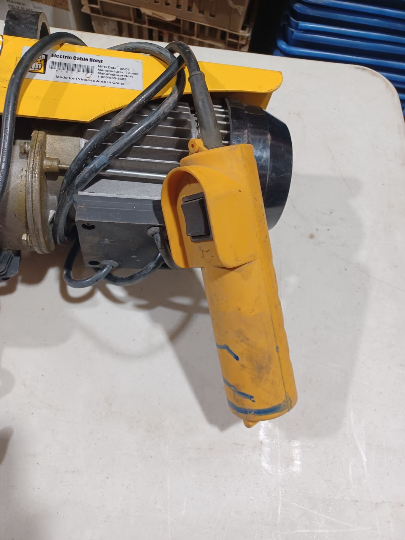 ELECTRIC CABLE HOIST COMES WITH A REMOTE CONTROL AND CUSTOM CEILING HANGER FOR PIPE. GREAT WORKING CONDITION