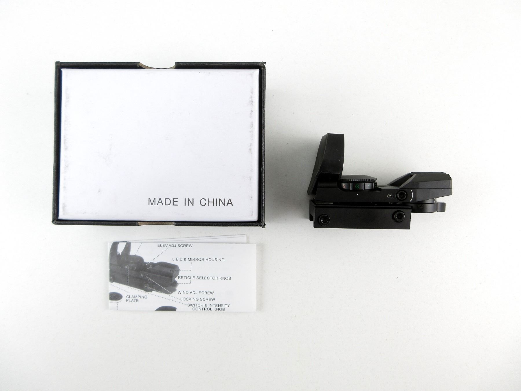 (1) CLEAR OPTICS, FOUR RETICLE OPTIONS, WORKING RED / GREEN ILLUMINATION, WITH VARIOUS BRIGHTNESS SETTINGS, UNMARKED, WITH LENS COVER & INSTRUCTION MANUAL. SEE PHOTOS.