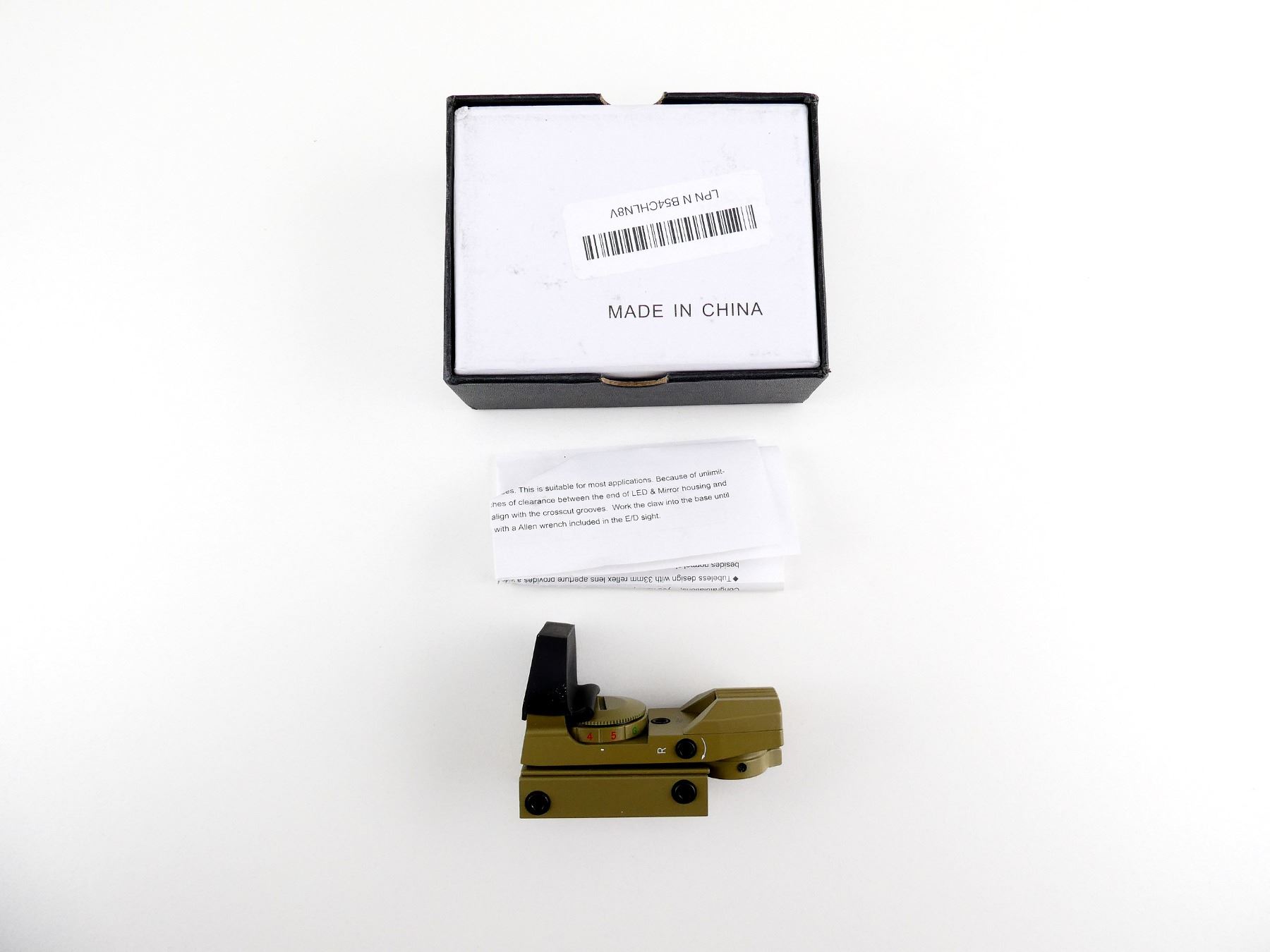 (1) CLEAR OPTICS, WORKING RED / GREEN ILLUMINATED RETICLE, WITH VARIOUS BRIGHTNESS SETTINGS, UNMARKED, WITH LENS COVER, INSTRUCTION MANUAL & ORIGINAL BOX. SEE PHOTOS.