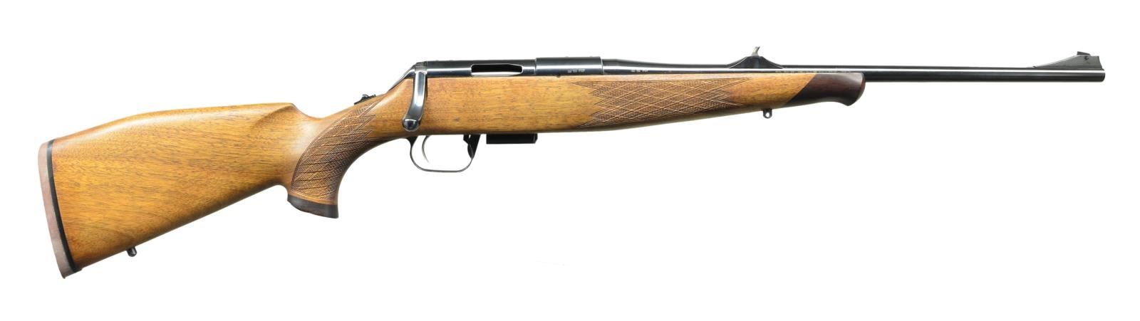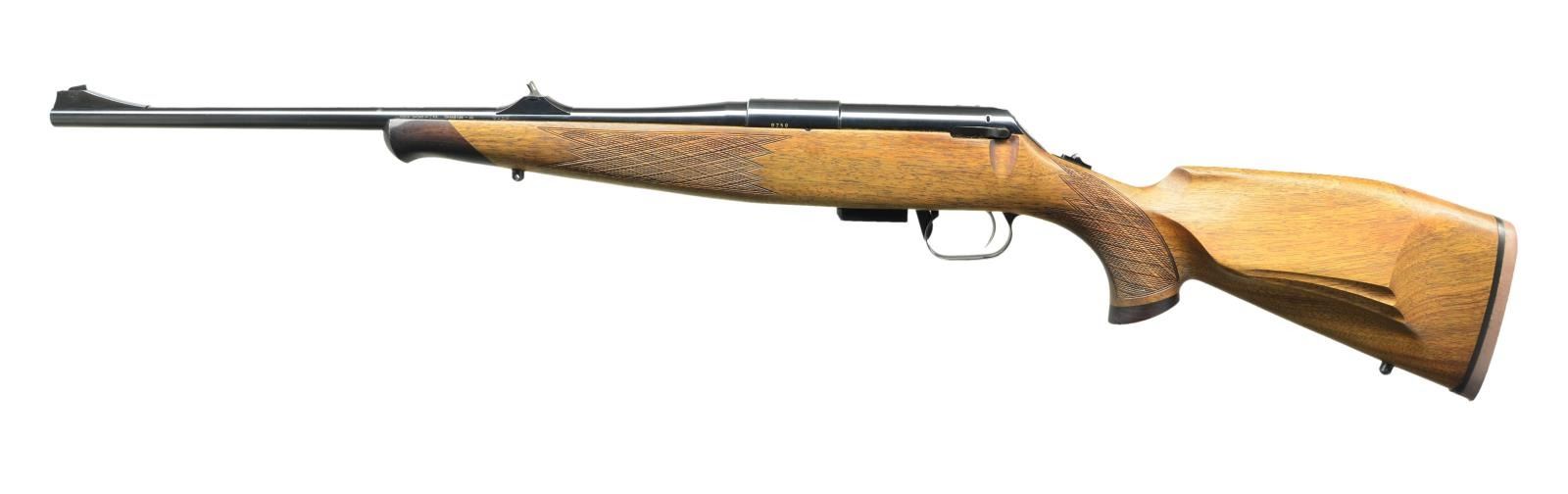 ACTION RIFLE. Cal. 5.7 UCC (Caseless) S# 0250. Bbl. 20.5". The Voere VEC91 claims to be the first mass produced caseless ammo hunting rifle. It utilizes an electronic ignition & has the potential for amazing accuracy due to the ignition rate of the nitrocelluloses charge, which is faster than traditional smokeless powders by a factor of 10. It also has no residue after burning, so no spent case to eject. It simply burns up completely making the chamber ready for another round. The electronic trigger is activated w/ the assistance of two 15 volt batteries located in the pistol grip. Blued finish steel. Ramped blade front & drift adjustable dovetailed rear sights. Walnut stock w/ Bavarian cheekpiece & Scottish Fish Scale Checkering on forend & pistol grip. MAGS: 1 factory 7 rd. UNATTACHED ACCESSORIES: foam lined black plastic Gun Guard case, factory paperwork, 2 Varta 15v batteries & 2 boxes (24 rds. total) JagerSport 5.7 caseless ammo. CONDITION: all outward appearances as well as notes from consigner, indicate as new. No noticeable blemishing of any kind. Ammo appears serviceable though 1 rd. is missing priming compound. Bright bore w/ strong rifling. (23-66/JZ). MODERN. $1,000-2,000.
