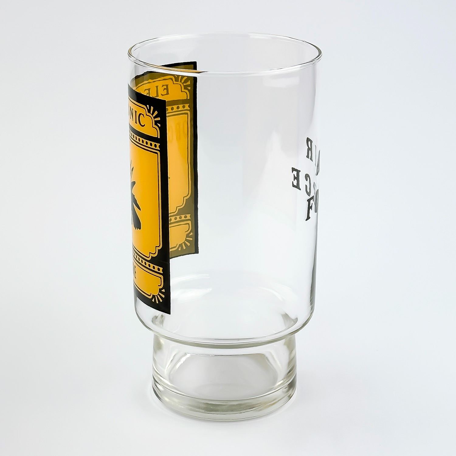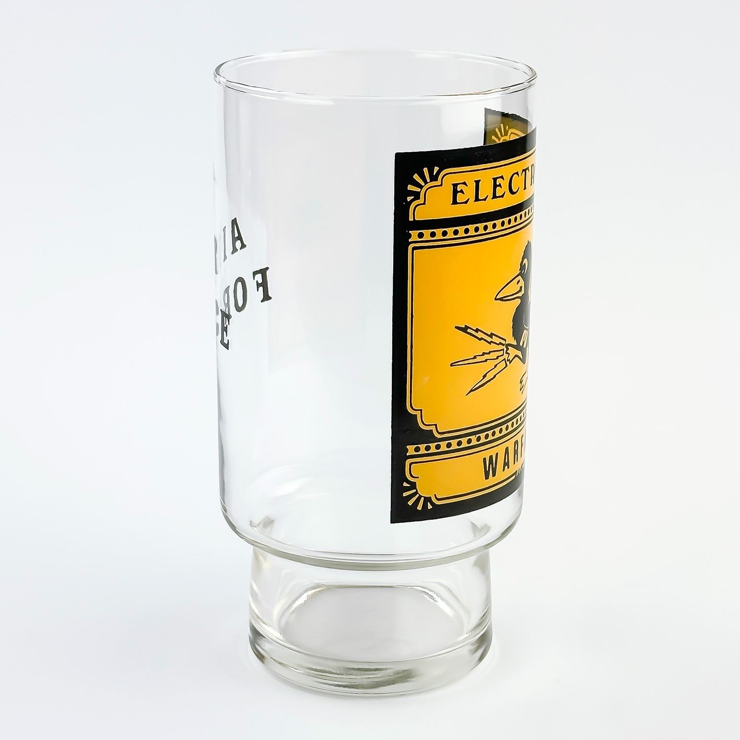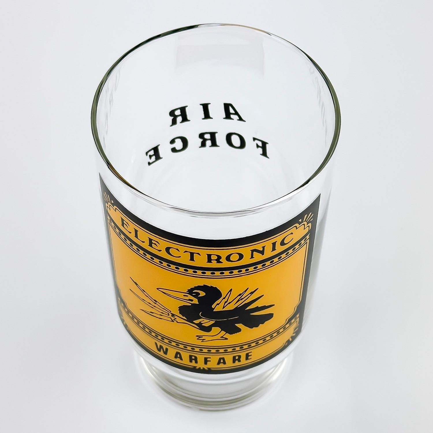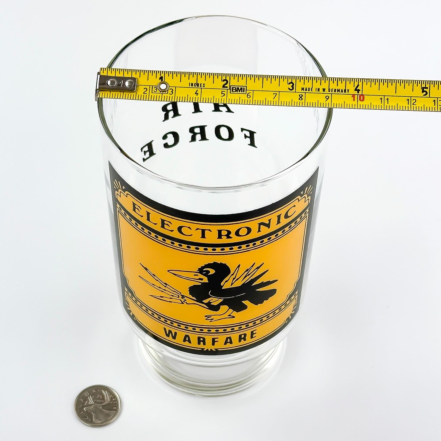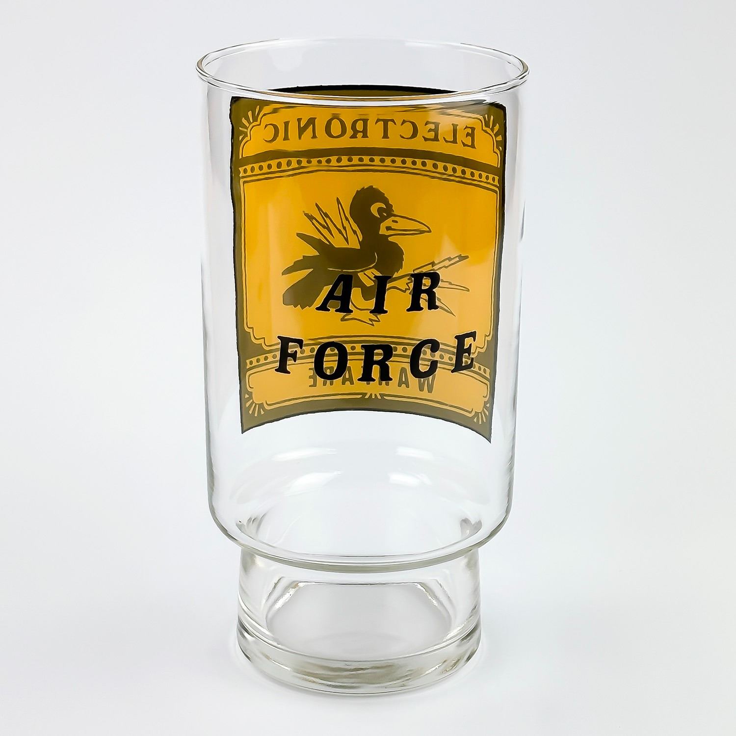 #8199 - LARGE AIR FORCE ADVERTISING GLASS MUG CUP. AGE & MAKER UNKNOWN. HOME DECOR BARWARE MUG MEASURES 7” (18 CM) TALL BY 3.5” (9 CM) TOP DIAMETER