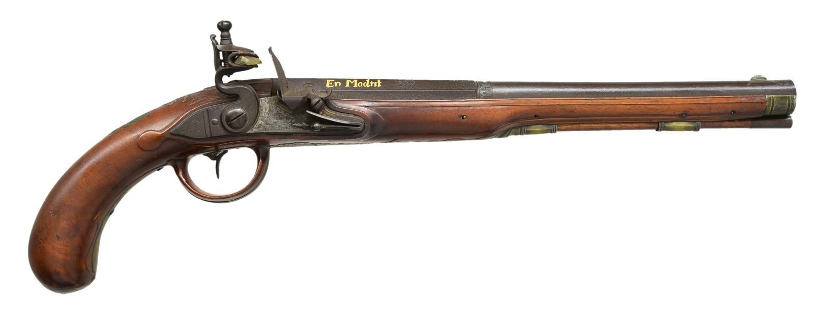 BOSLER FLINTLOCK PISTOL MADE WITH ELABORATE SPANISH BARREL. Cal. 56. NSN. Bbl. 12 1/2". 18" Overall, stippled oct. to rnd. bbl., chisel engraved beaded wedding band transition w/ gold insets of maker Diego Esquibel, Madrid 1734. Engraved lock signed “F. J. BOSLER / a Darmstadt”, unsupported serpentine cock, unbridled frizzen, faceted pan, chamfered edges, long rebated tail. Silver plated brass mounted stock w/ raised arabesque scroll carving behind tang & forward of triggerguard. Incised carved wood trigger guard covered by ornate engraved brass w/ raised wood molding. Thumb plate has crown over panoply of arms w/ oval inset unknown crest. Lock escutcheons in the shape of dolphins. Bosler who worked from about 1740-1790 was well known German gun maker who often used high quality beautifully sculpted Spanish or Italian bbls. such as on this elaborate showpiece. CONDITION: fine to very fine overall, bbl. retains most of its brown finish & gold insets, lock has smooth mottled gray/brown patina. Brass mounts retain varying amounts of thin silver plate. Stock is sound & solid w/ old varnish blending in a couple expert repaired cracks. Mechanically fine though mainspring is weak, clear smooth bore. (01-19988/JS). ANTIQUE. $4,000-5,000.