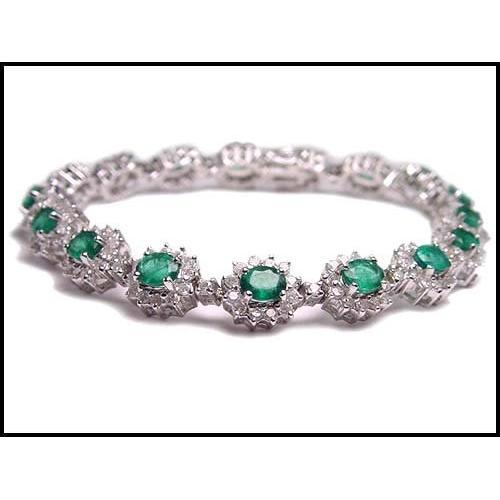 This elegant 18K white gold (21 grams) bracelet shouts CLASS! 17 natural, pleasing, rich color emeralds (5.7 carats), and 221 sparkling diamonds (well over 3 carats for sure) create candy for the eye. It is the work of a gifted goldsmith. It measures 8mm (5/16") wide, and is 7 1/2 inches long. Where or when would you find such a piece for less than half of its $7400.00 price? The answer is HERE AND NOW. Not to be missed.