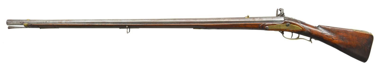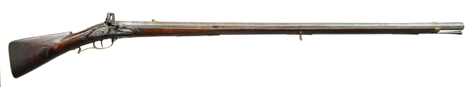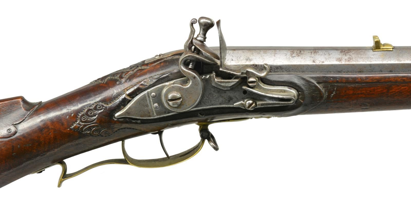 STYLE. Cal. 72, 13 (bore). NSN. 58" Overall. Bbl. 44 1/2" tapered oct. swamped. Rarely seen are European copies of American Kentucky long rifles. This example appears to be just that made late 18th century in lg. military caliber w/ multi groove rifling. There are no external markings other than the lock “DAVID / DIVORNE” most likely Swiss. Rifle is brass mounted including sights. Stock is burl walnut w/ relief & incised carving. Consignor believes there is a connection between the Vorne family of Lancaster County, Pennsylvania, which is quite possible as a Swiss gunmaker copying a Lancaster back home. This is not your standard Germanic Jaeger rifle. Condition: very good to fine overall, iron is mottled gray patina, brass has light mustard patina, stock is sound & solid w/ a lg. vertical crack in burl on bottom of buttstock which has been filled. Mechanically fine w/ crisp rifled bore. PROVENANCE: From the Collection of John "Tim" Breth Jr. (01-17797/JS). ANTIQUE. $3,000-4,000.