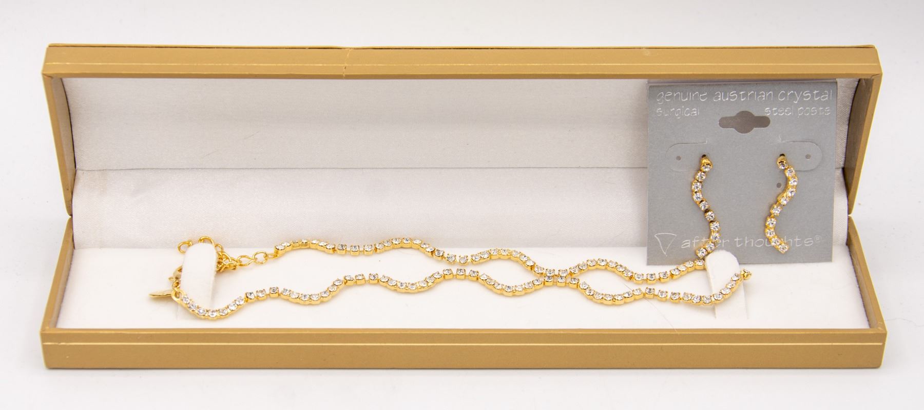 COLLAR NECKLACE W/ LOBSTER CLAW CLASP- GENUINE AUSTRIAN CRYSTAL/ GOLD TONE SETTING. C/W MATCHING DROP EARRINGS. **ALL ITEMS MUST BE REMOVED BY 5PM SATURDAY, MARCH 18TH 2023. ALL REMAINING ITEMS WILL BE SUBJECT TO A $6.00 PER DAY STORAGE CHARGE. ANY ITEMS REMAINING AFTER MONDAY, APRIL 3RD, 2023 WILL BE CONSIDERED FORFEITED. NO REFUNDS WILL BE ISSUED FOR FORFEITED ITEMS. TO SCHEDULE A PICK UP APPOINTMENT CLICK HERE
